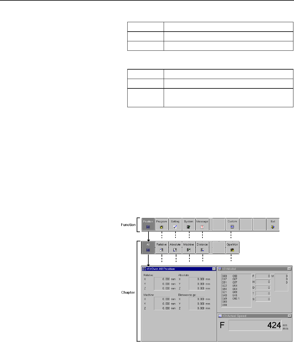 • Page 33B-62994EN/02 2. BASIC KNOWLEDGE (5) Axial movement and dwell status Status Meaning **** Others Motn Moving along an axis Dwel Dwelling Wait Waiting (only for 2-path lathe systems) (6) M, S, T, and B function status Status Meaning Fin Waiting for processing (7) Emergency stop status Status Meaning Em