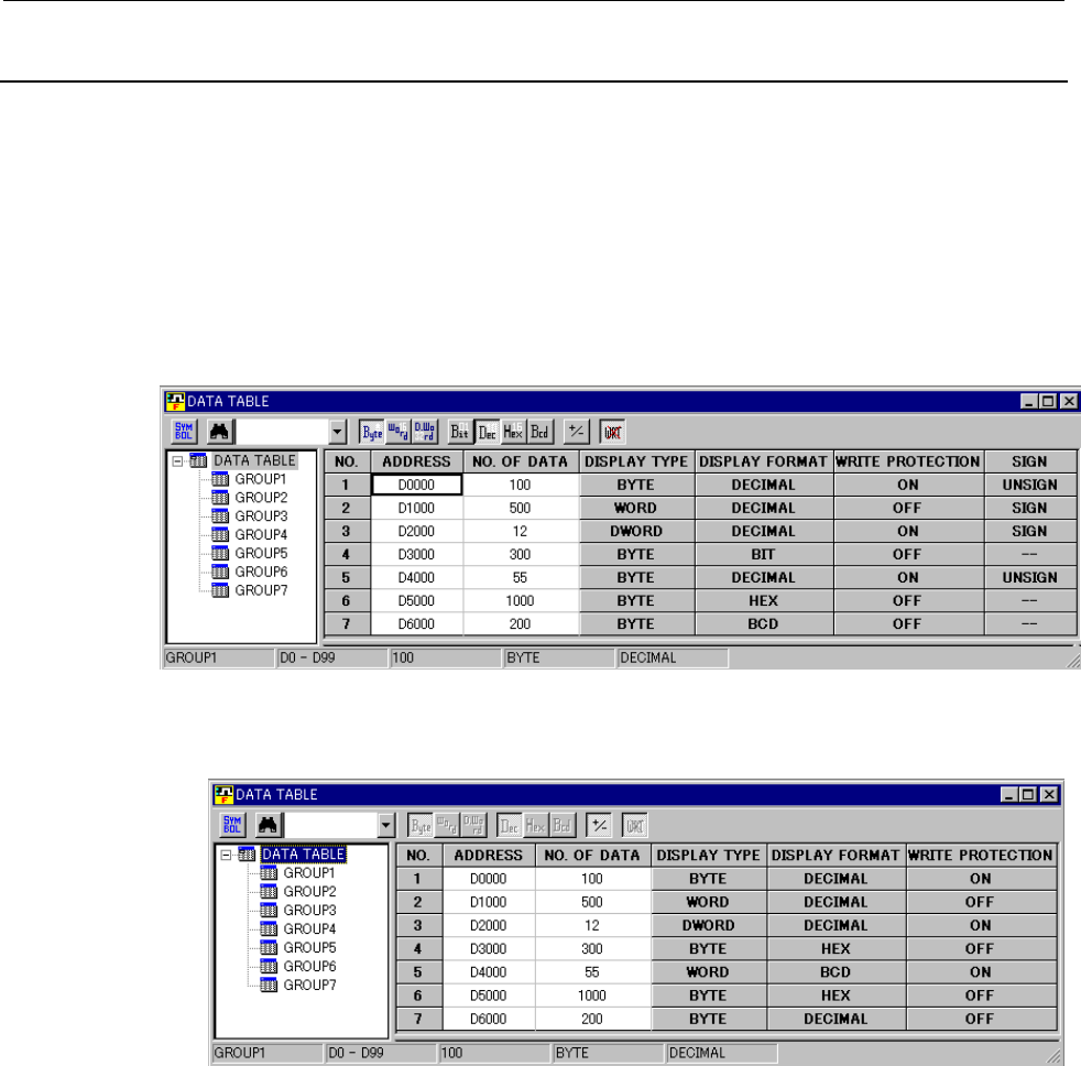 (1) Data table control data screen