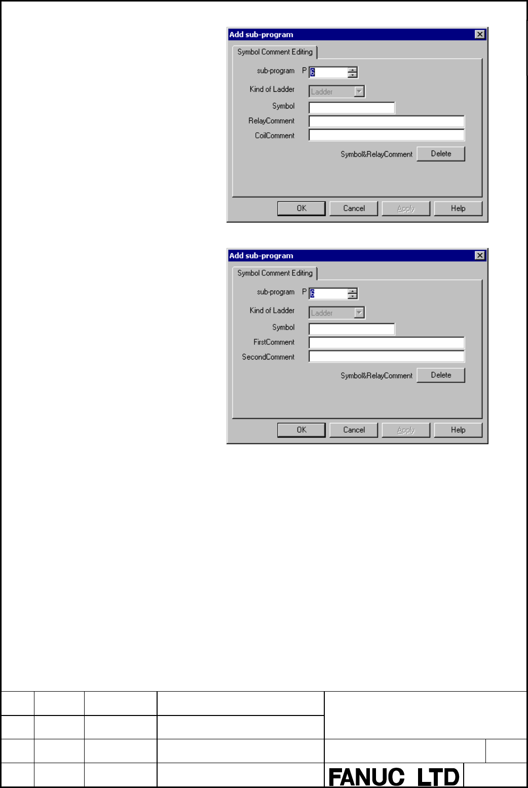 • Page 513Fig. 3.3.12(f) For the PMC type which corresponds to plural comments (30i/31i/32i-A with extended function) 4. Input the subprogram name. 5. Input the symbol and the comment, and push < OK > or button. 6. The subprogram is copied, and the screen of the added ladder program is displayed. *Suppo