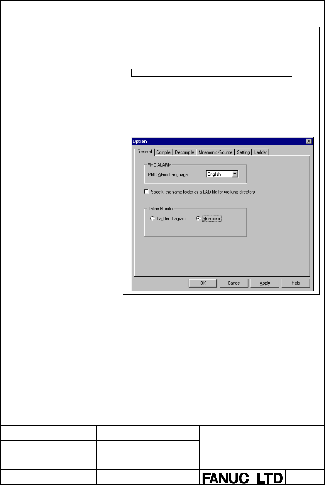• Page 551NOTE As to the folder for saving/restoring multi-language PMC message, you can choose the default of the folder for saving/restoring by the Specify the same folder as a LAD file for working directory in the [General] tab of the option.(select the [Tool] - [Option...]) - Checked(Initial value) --- Th