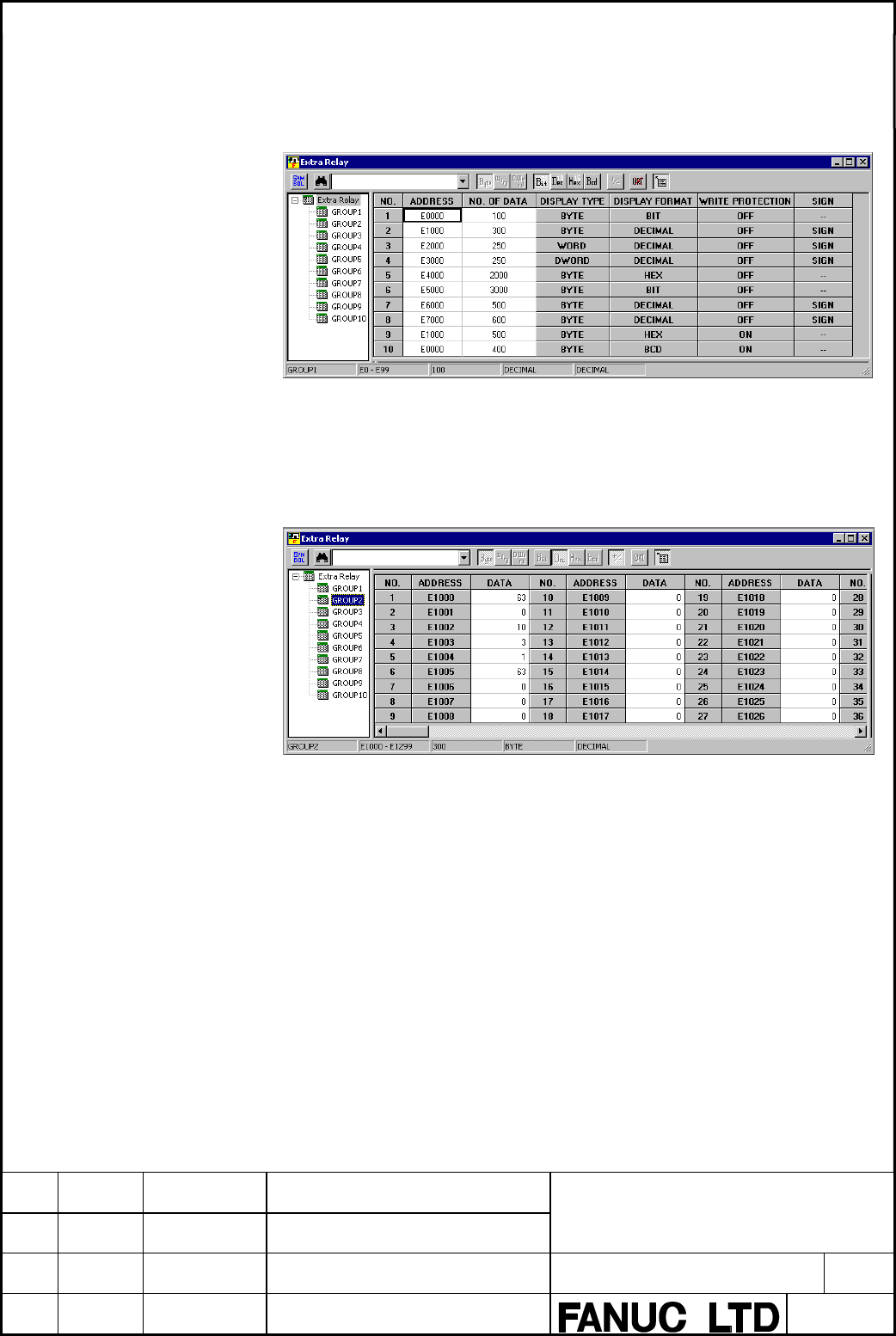 • Page 556(1) Control data of extra relay The control data to manage extra relay is displayed,when [Extra relay] in the tree at the left window is selected Fig. 9.3.7 (a) (2) Extra relay The contents of the selected group number is displayed according to the control data of extra relay (E). Fig.9.3.7 (b) TITL