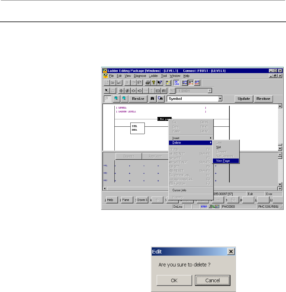 Page 89B-63484EN/05 3.CREATING AND EDITING SEQUENCE PROGRAMS 3.3.15 Deleting Page Breaks This subsection describes how to delete page breaks. Procedure 1 In the display window, position the mouse pointer to the page break you want to delete, and then right-click. Fig. 3.3.15 (a) 2 Select [Delete] - [New pa