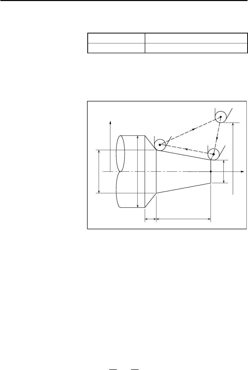 Page 453! Taper cutting cycle (R)⋅⋅⋅Rapid traverse G90X(U)__ Z(W)__ R__ F__ ; (F)⋅⋅⋅ Specified by F code X 4(R) U/2 3(F) 1(R) 2(F) R X/2 w Z Z Axis ! Signs of numbers Fig. 13.1.1 (b) Taper Cutting Cycle specification in the taper cutting cycles In incremental programming, the relationship between the sign o