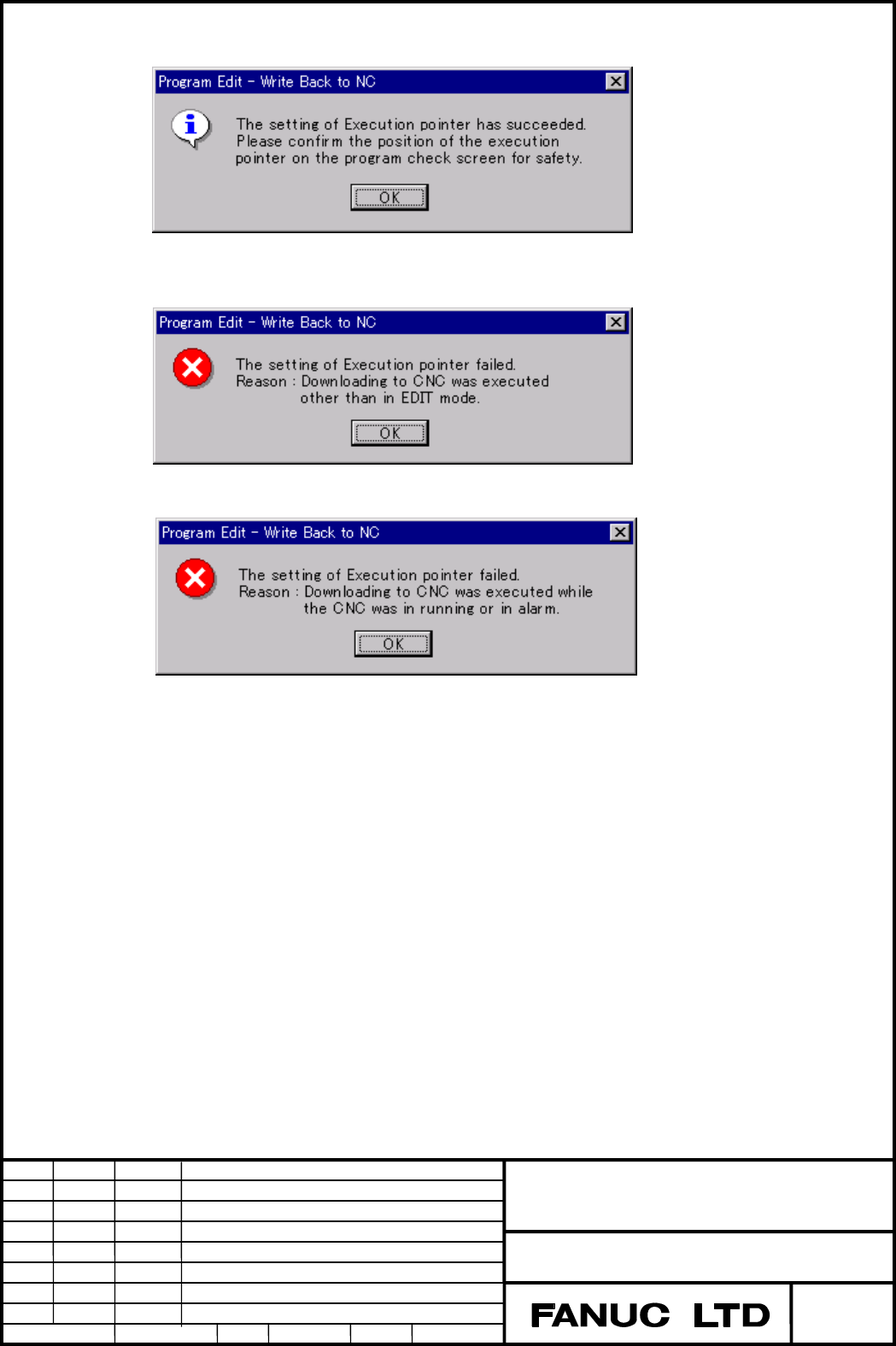 • Page 53) Post process after downloading of the NC program. When the Execution pointer is updated normally, the following message is displayed. When the setting of the Execution pointer was failed, the following message is displayed. Downloading to CNC is executed other than in EDIT mode. Downloading to CN