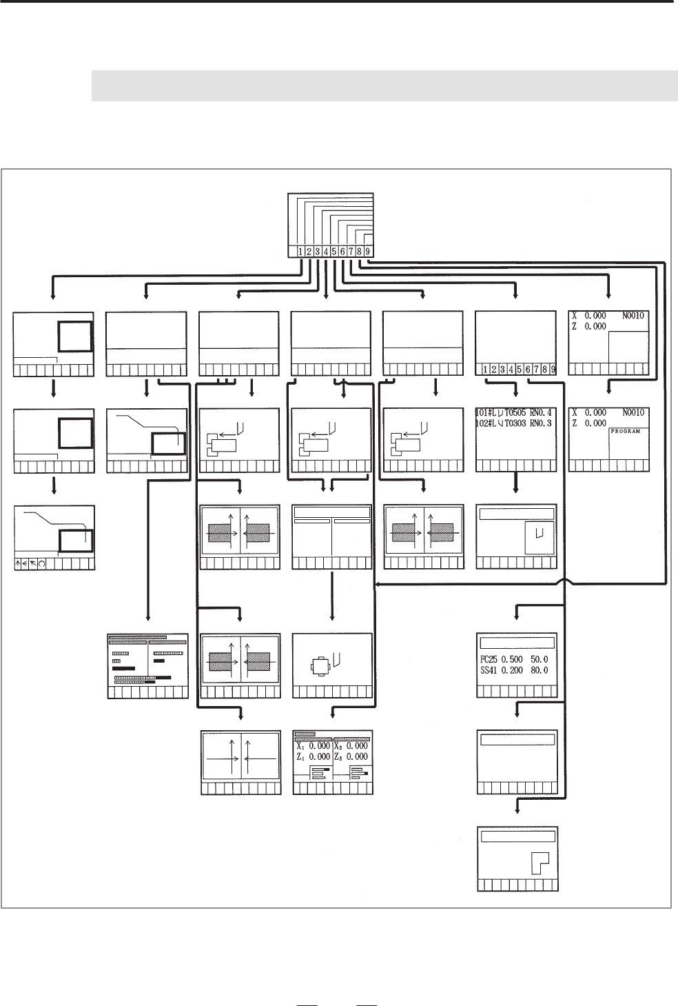 Page 305. HIERARCHY OF THE B–62444E–1/04 GENERAL CONVERSATIONAL SCREENS 5 HIERARCHY OF THE CONVERSATIONAL SCREENS Main menu Creating programs Editing programs Machining simulation Direct operation Converting NC programs Tool/cutting condition data Tool offset PROGRAM PROGRAM LIST PROGRAM LIST PROGRAM LIST