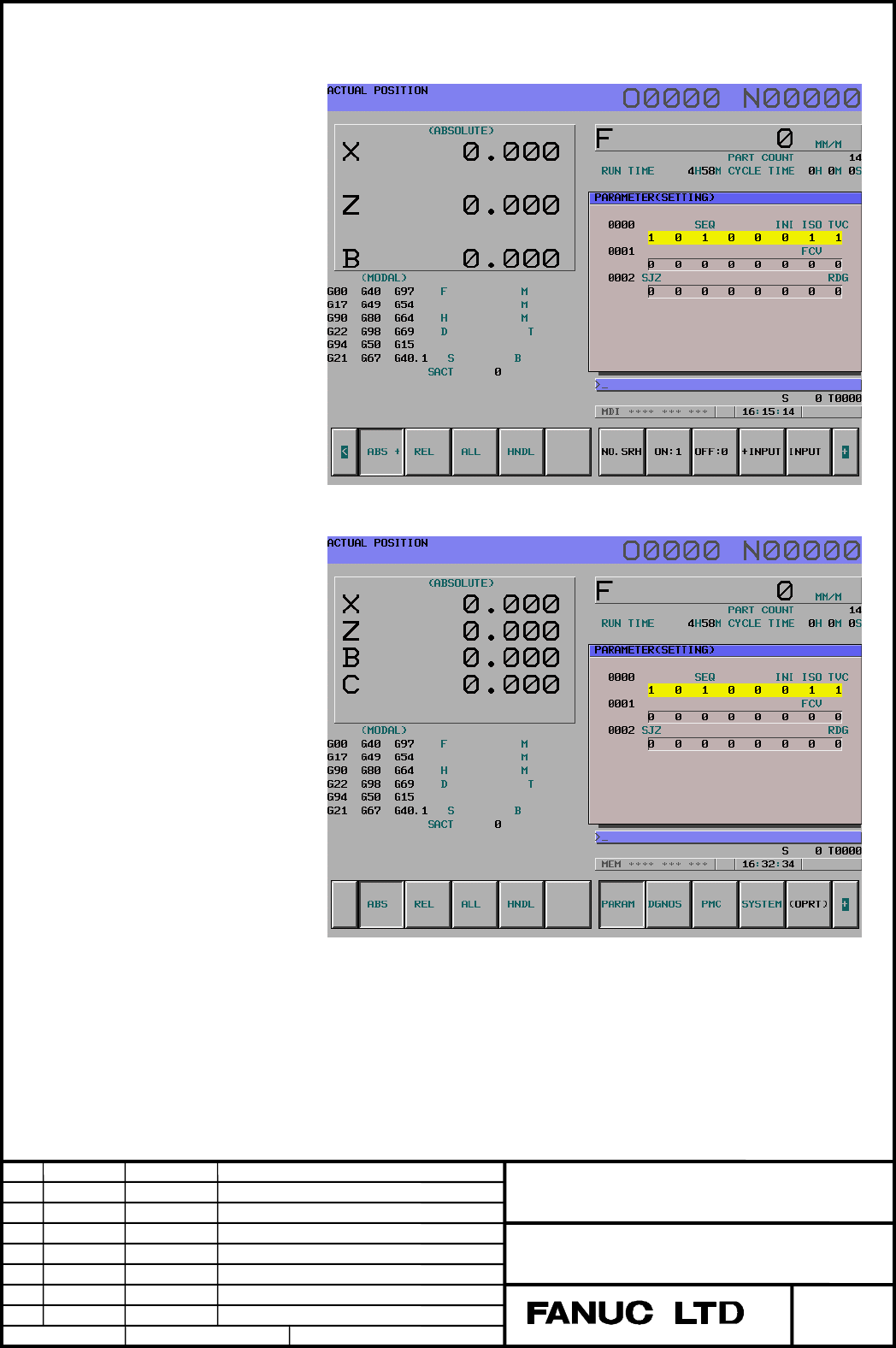 • Page 77-soft key type display (1) Absolutely coordinate [Usually display(No.13102#0="0")] [Top alignment display(No.13102#0="1")] Title FANUC Series 16i/18i/21i-B Drawing No. A-79605E Page Edit Date Signature Description 7/12 2002/08/29