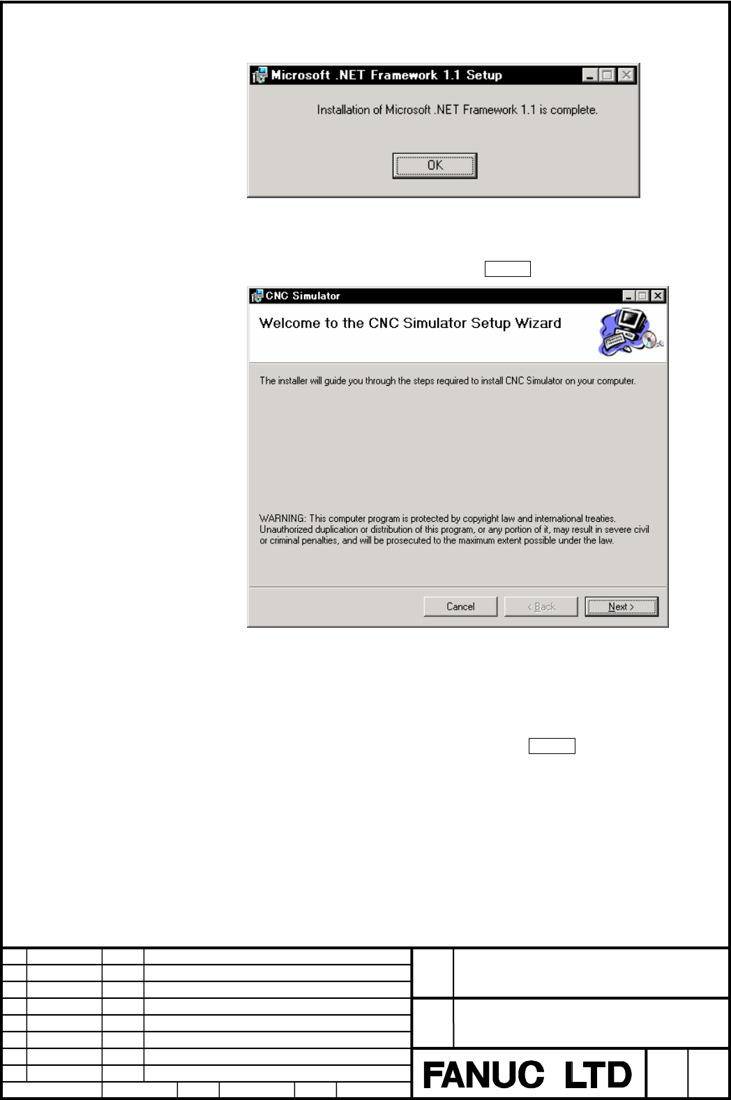 • Page 83. Installation of Microsoft .NET Framework1.1(SP1) starts. 4. When installation ends, the following message appears. Click OK. Title FANUC CNC Simulator for PC Oprator’s Manual Draw No. A-90000E/01 Edit Date Design Description Page 8/41 Data Feb.01.2005 Desig. H.Yamada Apprv