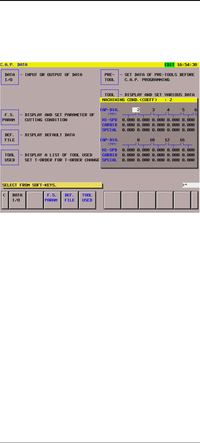 • Page 67GFKE-0041A-EN Cutting Conditions 8. 2. 2 Machining Condition (HOLE-TAP) : 1 Pushing the Softkey (TAP), the Machining Condition table (TAP) is selected. In this table Cutting speed only, according to different workpiece materials and tool materials can be input. The feedrate will be calculated automa