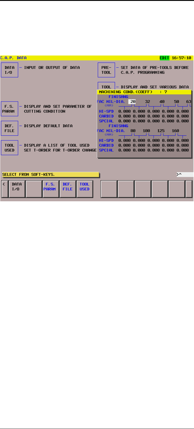 • Page 56Cutting Conditions GFKE-0041A-EN 8 F.S. File (Cutting Conditions) The ’New F.S.-File’ is selected by pushing softkey in C.A.P. Basic Fig. 8. 1 Sreen. 4 Items can be selected by softkey: • 1. Machining Condition Hole • 2. Machining Condition Mill • 3. Machining Condition Special • 4. Machining Condit