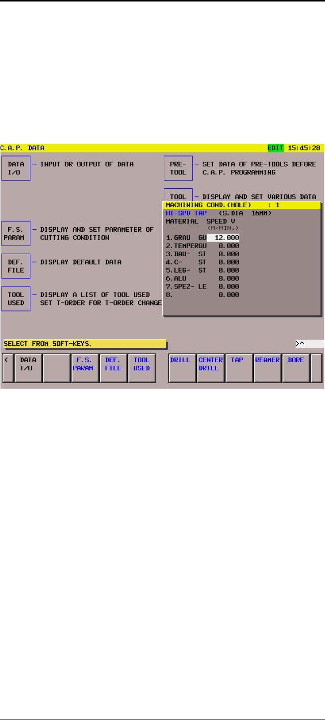 Pushing the Softkey (TAP), the Machining Condition table (TAP) is