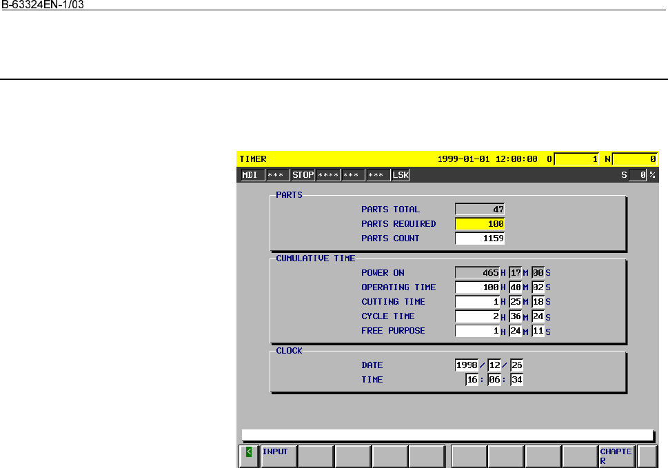 • Page 712.OPERATIONAL DEVICES OPERATION B-63324EN-1/03 2.5.5.4 System Function key on the MDI panel Soft keys SYSTEM SYSTEM CHAPTER                                                No. Chapter menu Explanation (1) PARAMETER Selects