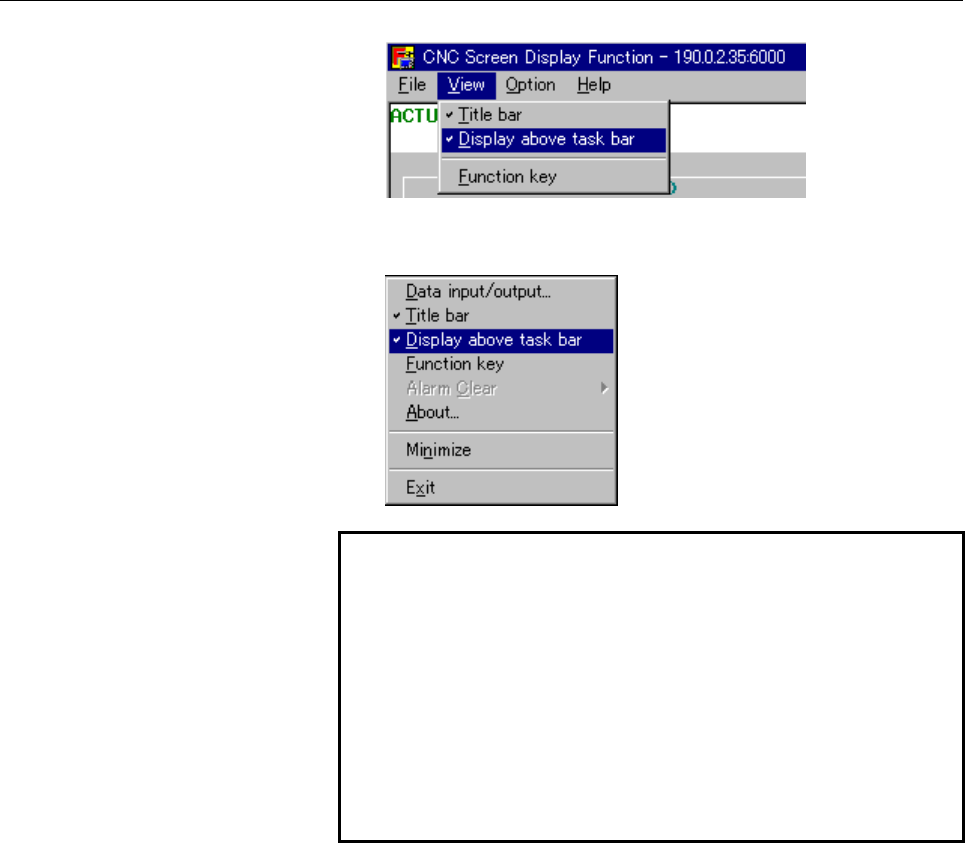 • Page 39B-63164EN/04 2.OPERATION A pop-up menu, shown below, appears. Choose [Display above the task bar]. NOTE 1 When the CNC screen display function is started, the CNC display screen to be displayed is determined according to the following CNC parameters: CNC parameters: Nos. 3198 and 3199 (CNC parameter