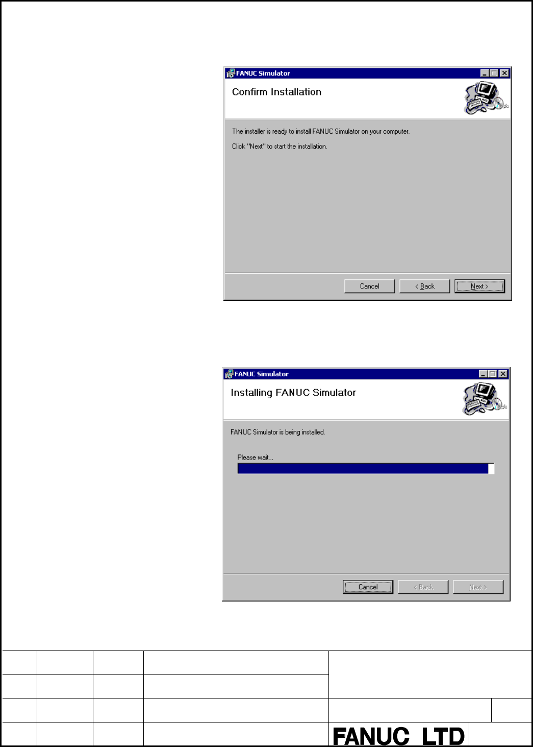 • Page 174-4 After the "Confirm Installation" window appears, click . Fig.2.2.1 (m) Confirm Installation window 4-5 Installation of FANUC simulator starts. Fig.2.2.1 (n) Install-in-Progress window FANUC PMC Simulator Operator’s Manual 01 05.08.01 T.Maruyama New registration DRAW.NO. A-90139EN/01 EDIT D