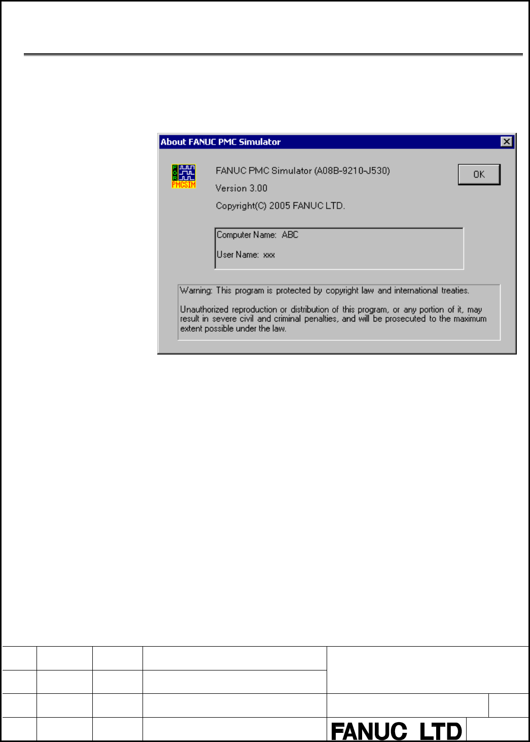 • Page 233.2 DISPLAY OF VERSION INFORMATION This section describes how to display the version information of this software for purposes of, for example, maintenance. Select [Help] - [About]. Fig.3.2 Version information FANUC PMC Simulator Operator’s Manual 01 05.08.01 T.Maruyama New registration DRAW.NO. A-9