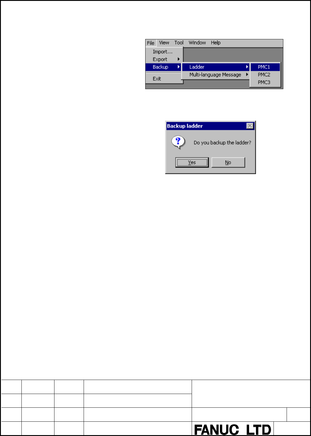 • Page 541. Select [File] – [Backup] and select the program and PMC path. At 30i/31i/32i-A PMC, select the PMC path. Fig.6.1.3 (a) Menu “Backup” 2. Click the < Yes > button. Fig.6.1.3 (b) Confirmation message FANUC PMC Simulator Operator’s Manual 01 05.08.01 T.Maruyama New registration DRAW.NO. A-90139EN/01