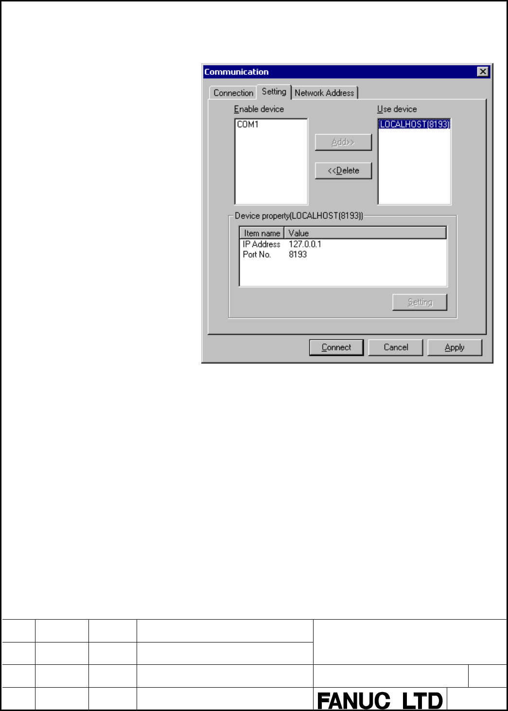 • Page 602. Select [Setting] tab, and move "LOCALHOST" to “Use device” setting by above 1. Fig.7.4 (c) Use device setting FANUC PMC Simulator Operator’s Manual 01 05.08.01 T.Maruyama New registration DRAW.NO. A-90139EN/01 EDIT DATE DESIG. DESCRIPTION 60/70