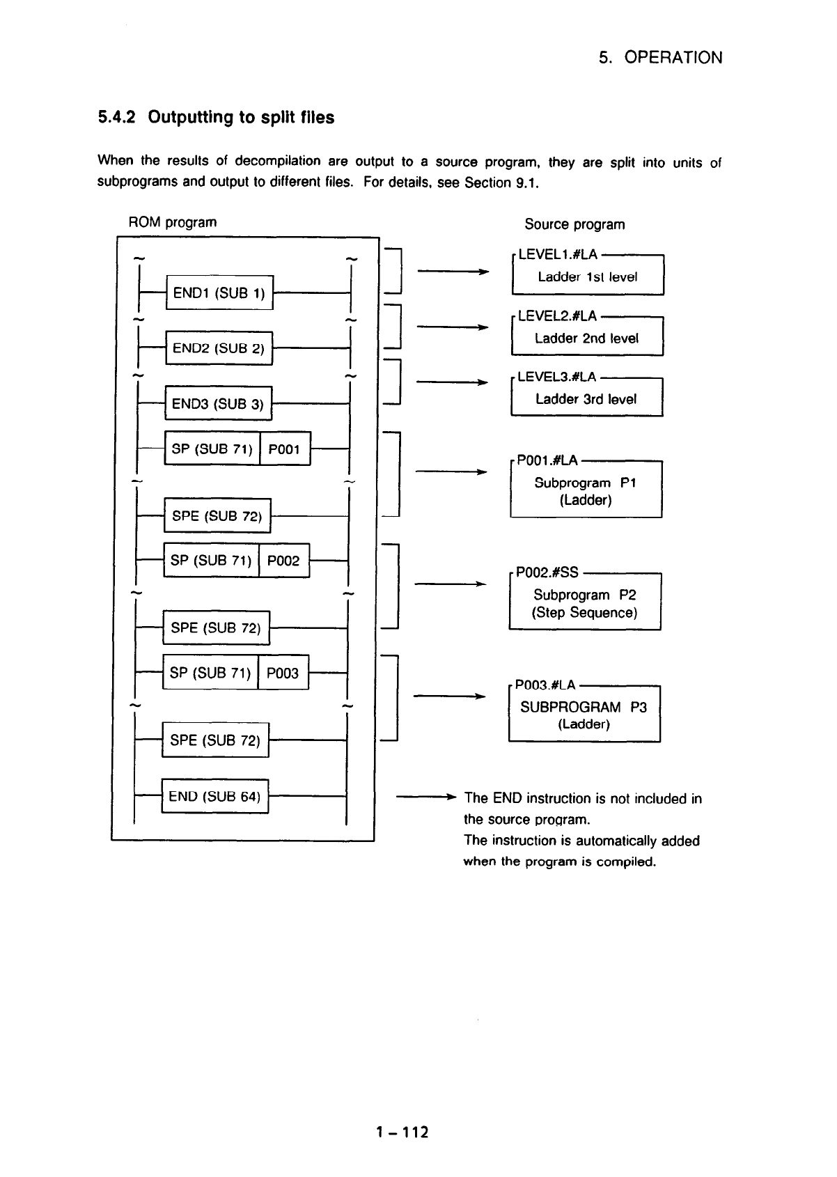• Page 2083. THE STEP SEQUENCE FUNCTIONS 1.5 Data Flow -PC9801*IBWPC/AT Source program Mnemonic program Ladder 1st level Mnemonic conversion A mnemonic program without Ladder 2nd level - step sequence Ladder 3rd level - Subprogram Pl 7 Subprogram P2 Compilation/Decompilation Object code I L ROM format program