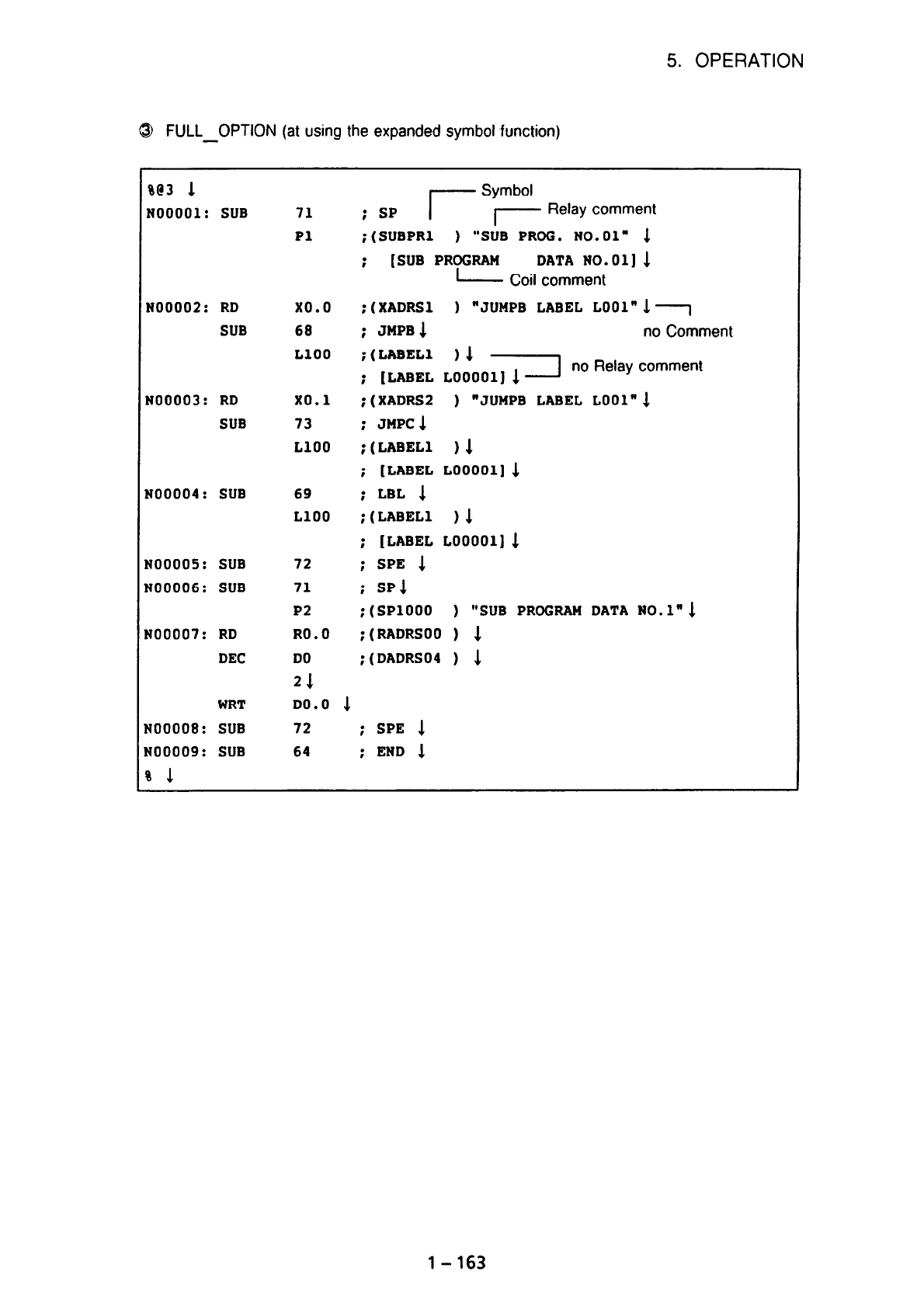 • Page 1705. OPERATION 0 FULL-OPTION (at using the expanded symbol function) %@3 1 Symbol NOOOOl: SUB 71 ; SP [_, Relay comment Pl ;(SUBPRl ) "SUB PROG. N0.01" 1 ; [SUB PROGRAM DATA NO.011 1 L-- Coil comment N00002: RD x0.0 ;(XADRSl ) "JUMPB LABEL Lool" l-_-1 SUB 68 ; JMPBJ no Comment LlOO ;(LABELl )l no Rela