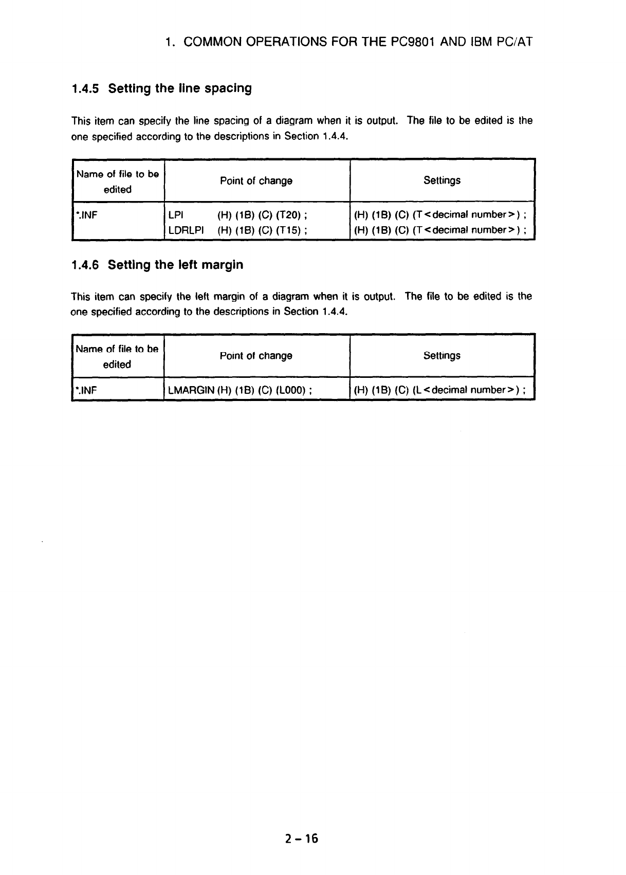 • Page 1951. COMMON OPERATIONS FOR THE PC9801 AND IBM PC/AT 1.4.5 Setting the line spacing This item can specify the line spacing of a diagram when it is output. The file to be edited is the one specified according to the descriptions in Section 1.4.4. Name of file to be Point of change Settings edited l.INF