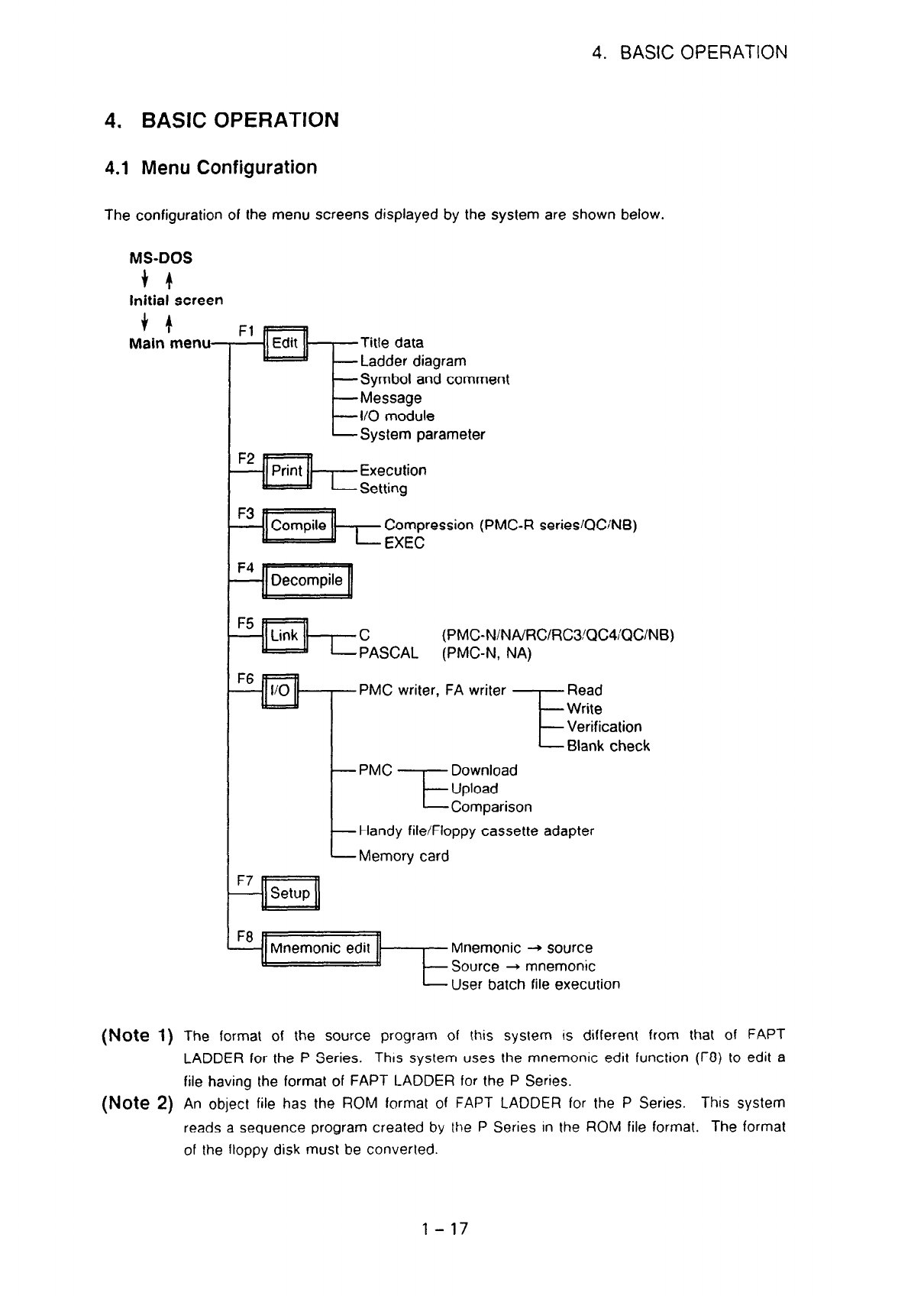 • Page 244. BASIC OPERATION 4. BASIC OPERATION 4.1 Menu Configuration The configuration of the menu screens displayed by the system are shown below. MS-DOS $- 4 initial screen f 4 Fl “’ Main menu- Edit Title data Ladder diagram Symbol and comment Message I/O module System parameter Print Execution l-Setting