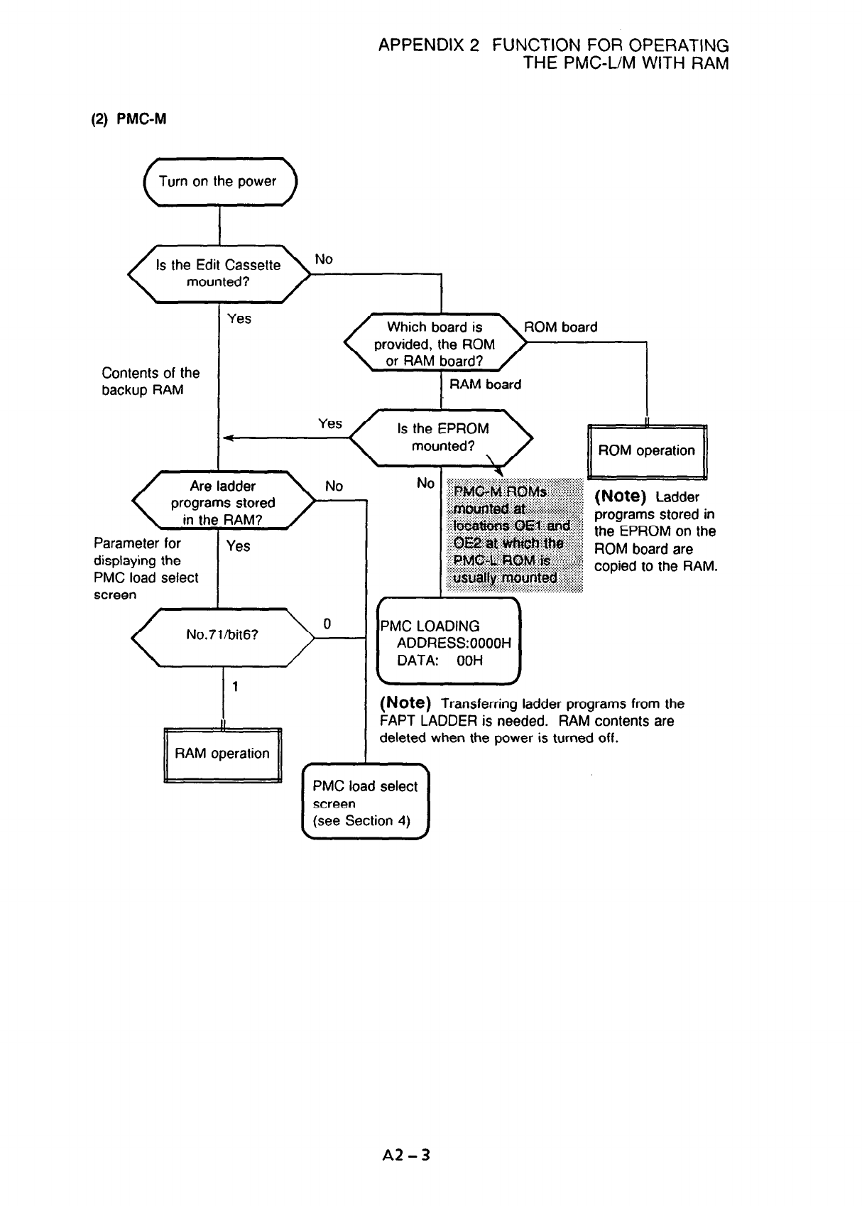 • Page 239APPENDIX 2 FUNCTION FOR OPERATING THE PMC-L/M WITH RAM 3. RAM OPERATION Follow the flowchart shown below to perform the RAM operation. (1) PMC-L Yes Contents of the No Is the EPROM backup RAM Parameter for Yes displaying the PMC load select screen (Note) Ladder programs stored in the EPROM are copie