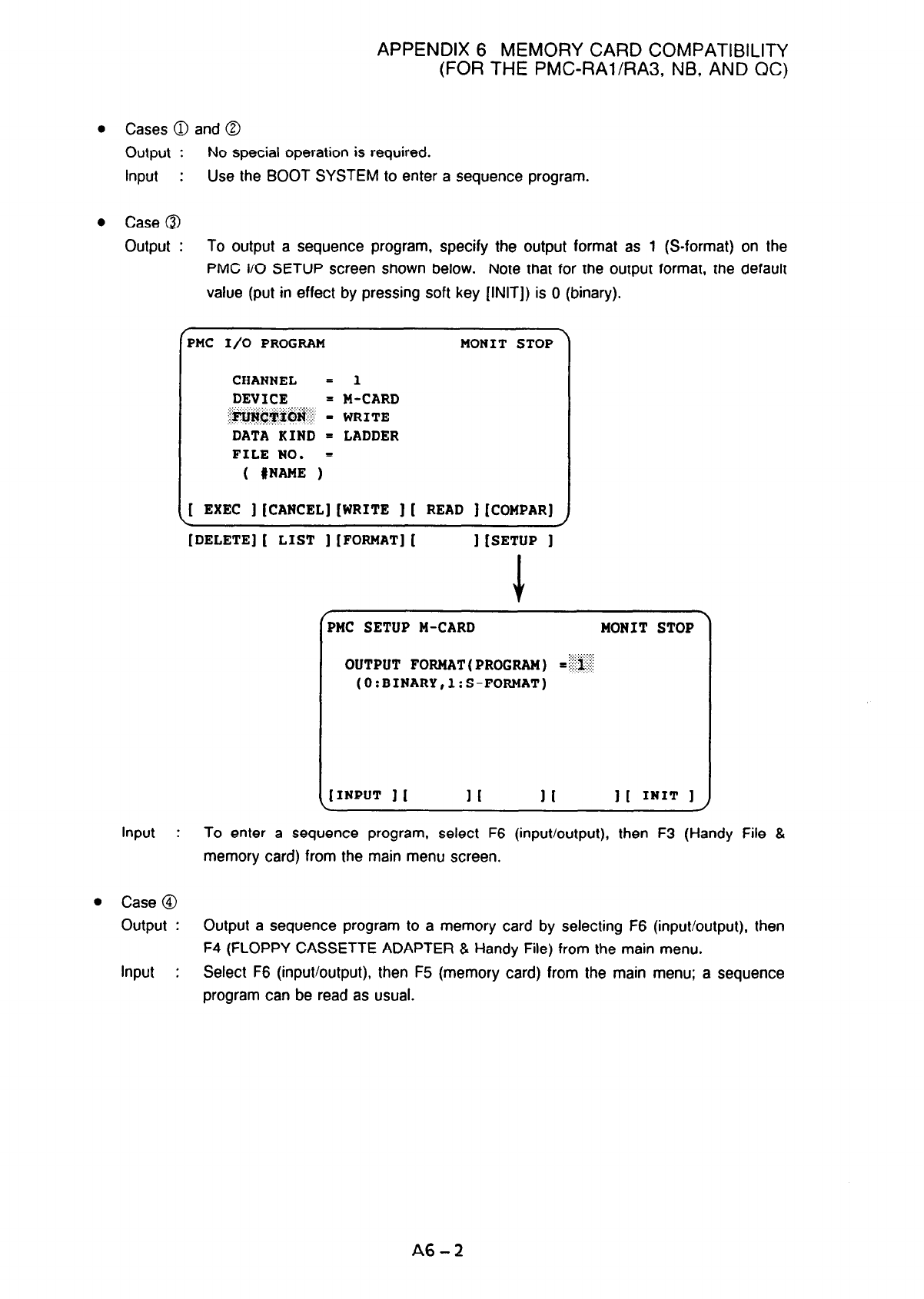 Select F6 (input/output), then F5 (memory card) from the main menu; a sequence