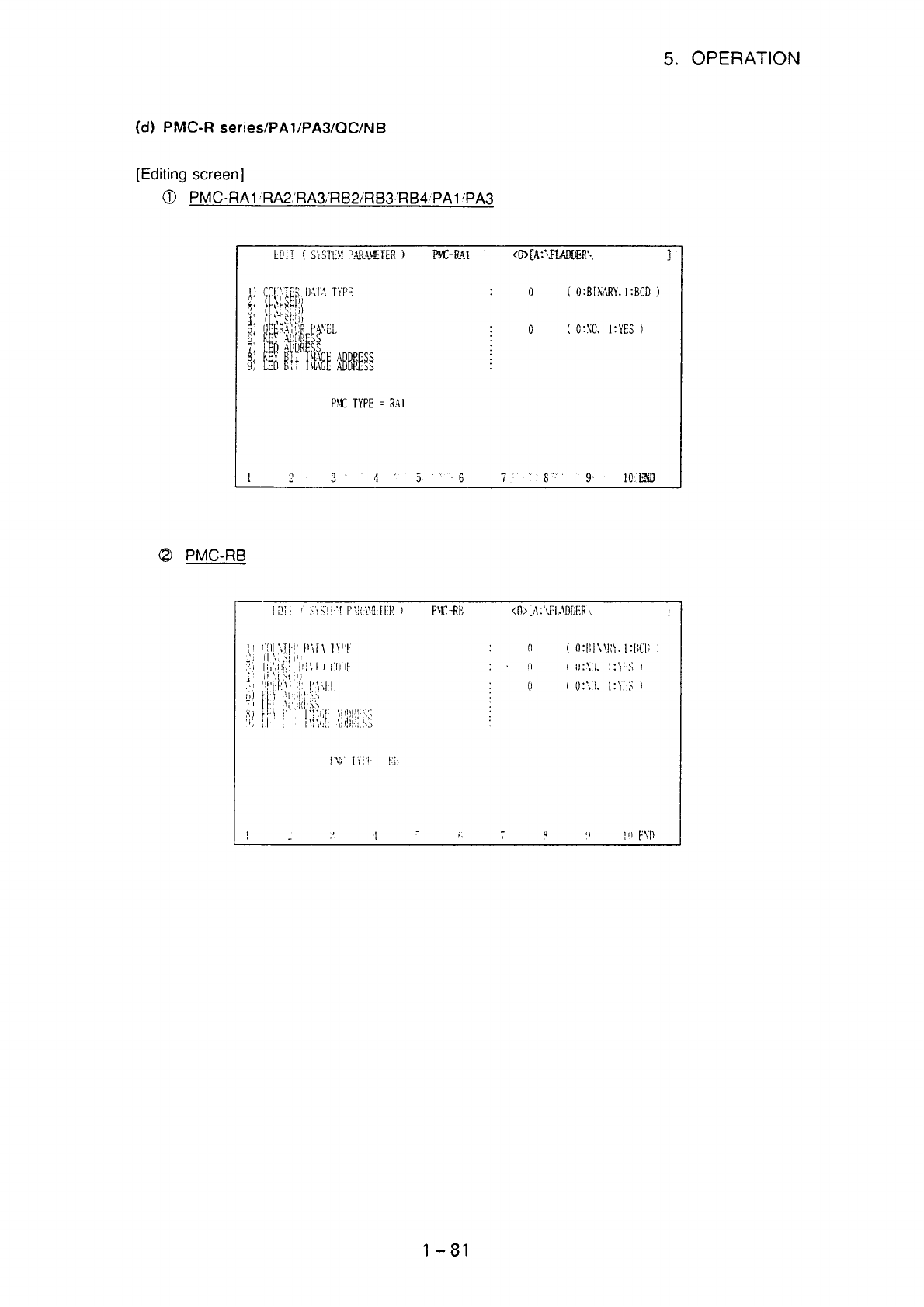 • Page 1665. OPERATION @ PMCRB,‘RB2RA3’RB3 se 0 1 2 BINARY1 2. Counter data type (Binary or BCD) 3 NO1 3. Whether an operator’s panel is used (YES: Used, NO: Not used) 4 PMC-RB1 4. PMC model (PMC-RB, PMCRB2 or PMC-RB) 7 1001 7. Ladder execution time (100% (fixed)) 9 YES1 9. Division/non-division method (NO: D