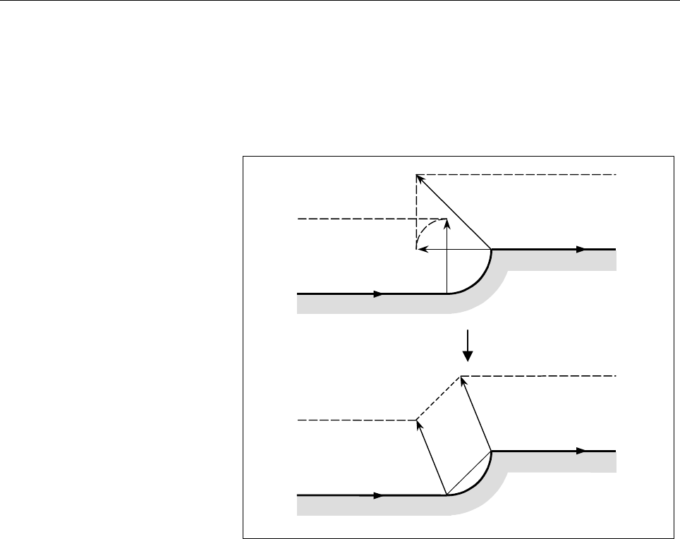 • Page 346・ Exponential interpolation Grinding wheel wear compensation can also be applied to exponential interpolation. Exponential interpolation is performed for the compensated positions. ・ Compensation plane and plane selection using G17/G18/G19 A compensation vector is created only on the plane (compensa