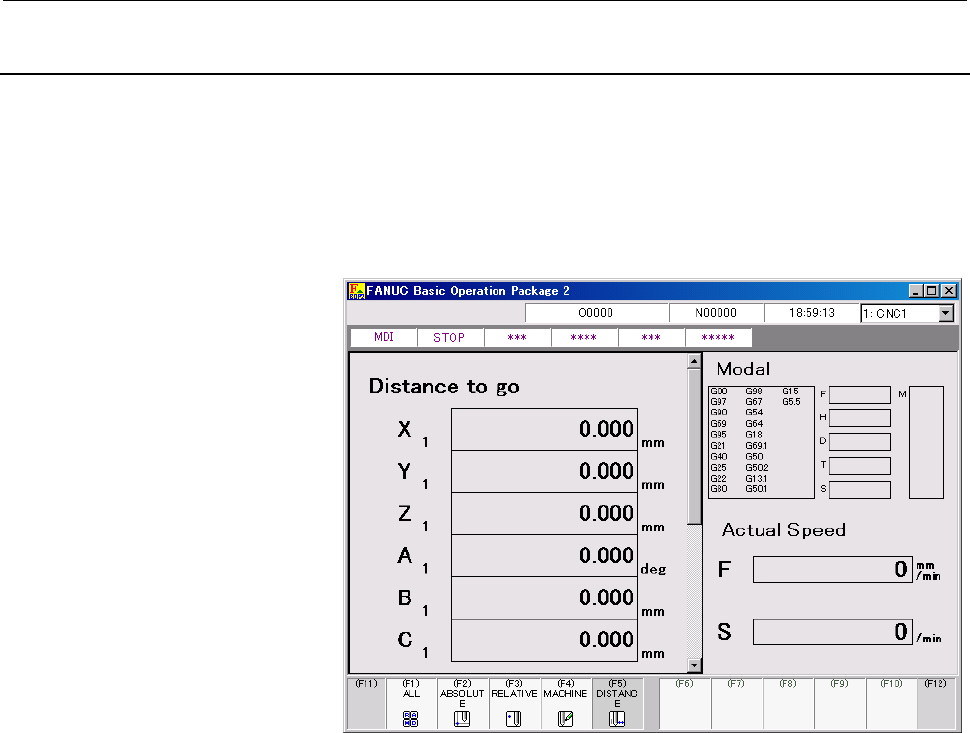 • Page 69B-63924EN/01 2.STANDARD OPERATION 2.2.5 Displaying the Distance to Go The distance to go of the CNC is displayed. Modal information (such as G codes) and actual speed information (actual feedrate and spindle speed) are displayed at the same time. This screen can be displayed by pressing the [POSITIO