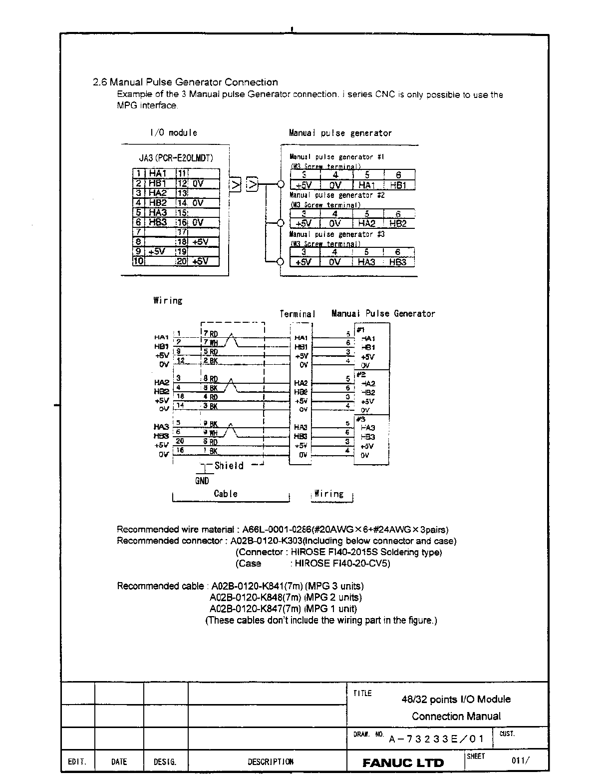 • Page 97SECTION 4: 48 / 32 POINTS I/O MODULE This section contains: • Drawing No. A-73233E/01 for I/O Modules: q A20B-2002-0520 (with MPG). q A20B-2002-0521 (without MPG). Note I/O points are not multiplexed.