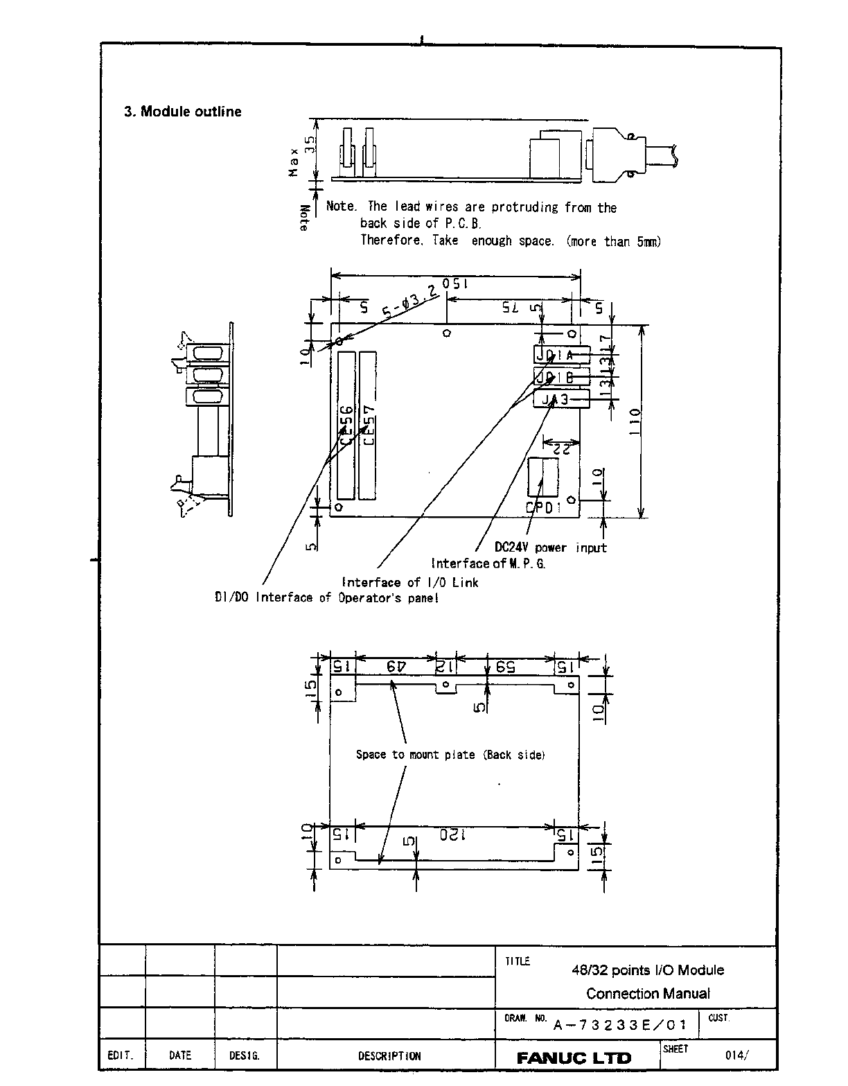 • Page 97SECTION 4: 48 / 32 POINTS I/O MODULE This section contains: • Drawing No. A-73233E/01 for I/O Modules: q A20B-2002-0520 (with MPG). q A20B-2002-0521 (without MPG). Note I/O points are not multiplexed.