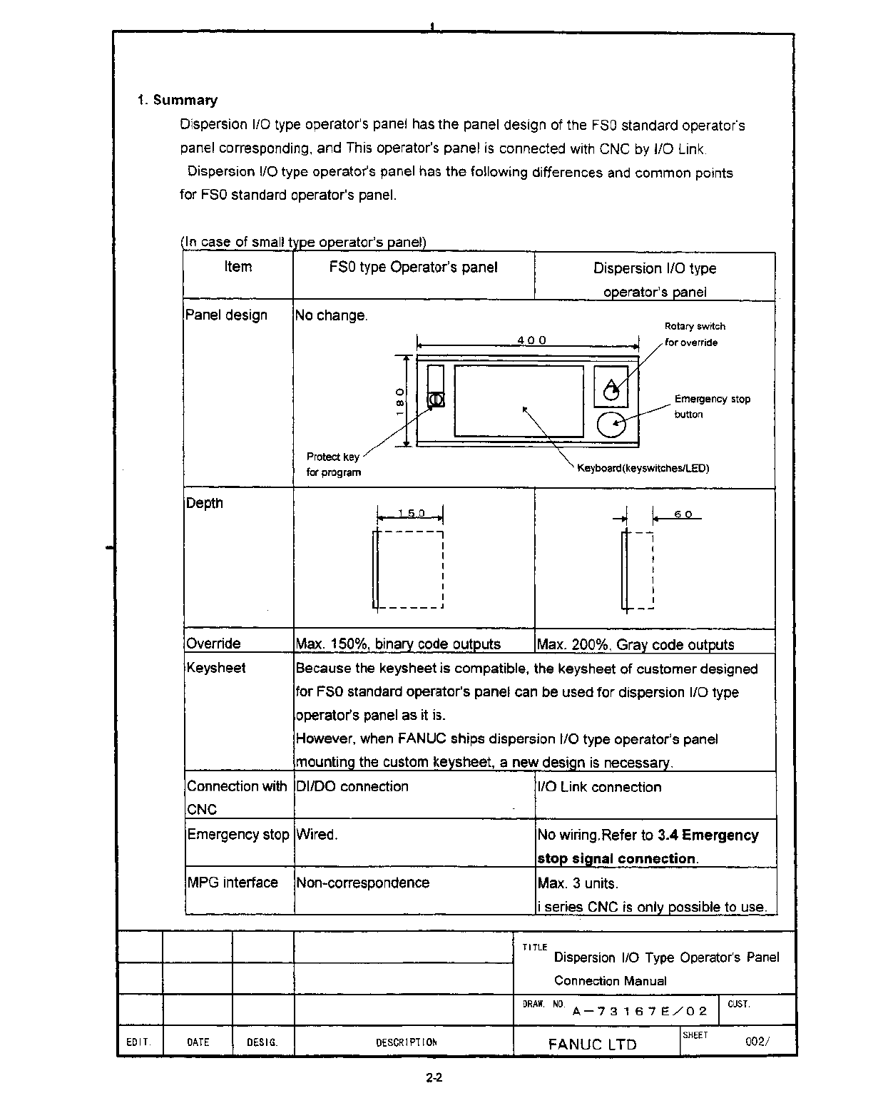 • Page 47SECTION 2: DISPERSION I/O TYPE OPERATOR PANEL This section contains: • Drawing No. A-73167E/02 for Dispersion I/O Type Operator Panels: ‰ A02B-0236-C140 (Full Keyboard). ‰ A02B-0236-C141 (Small Keyboard).