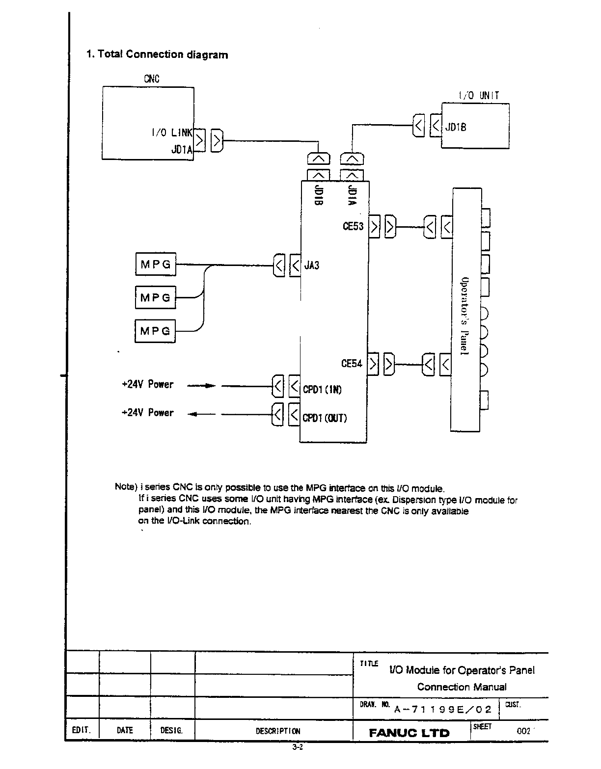 • Page 73SECTION 3: 72 IN / 56 OUT CONNECTION UNIT This section contains: • Drawing A-71199E/03 for Operator Panel Connection Unit A20B-2002-0470. Note Inputs are multiplexed. This panel must be ordered separately for use with all GE Fanuc North American i Series Operator Panels.
