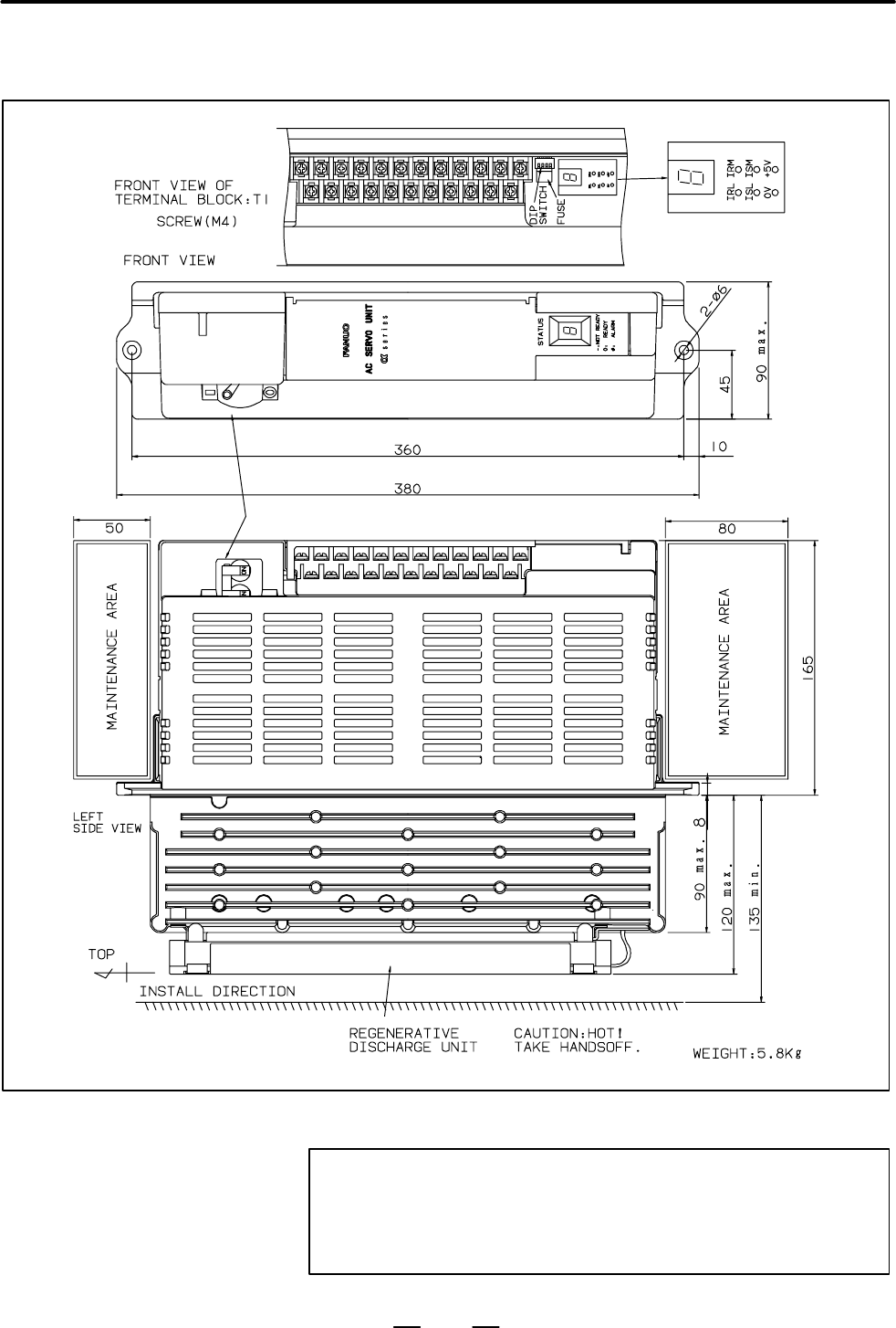 • Page 668. OUTLINE DRAWINGS AND AREA OF MAINTENANCE B–65192EN/02 (3) A06B–6089–H711 to H714 CAUTION The exhaust section becomes very hot. No part shall be mounted at the exhaust section. Designation Weight A06B–6089–H711 5Kg A06B–6089–H712 6Kg A06B–6089–H713 5Kg A06B–6089–H714 6Kg 50