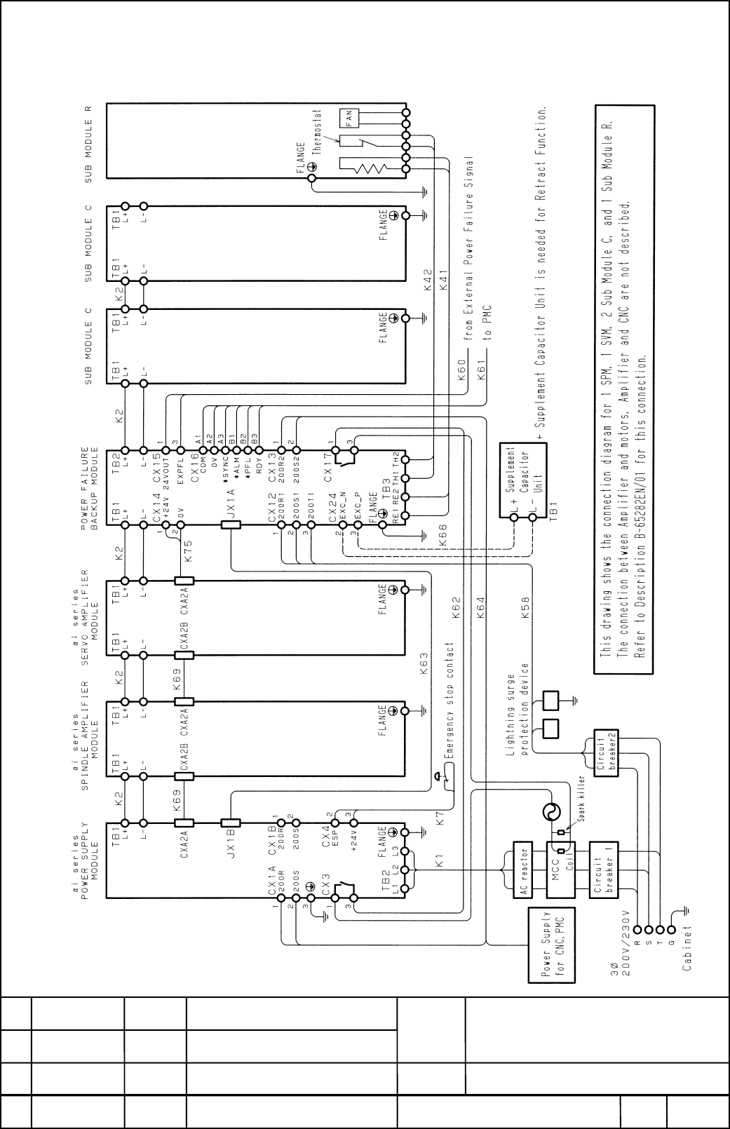 • Page 32. Overall connection diagram (for Power Failure Backup Module A06B-6077-H002) * In case of Power Failure Backup Module A06B-6077-H001, Cable K64 and K66 is not needed. Connection between αi series amplifiers Subject and Power Failure Backup Module 01 21.Sept.’01 S.Hanyu Newly designed DWG.No A-5386