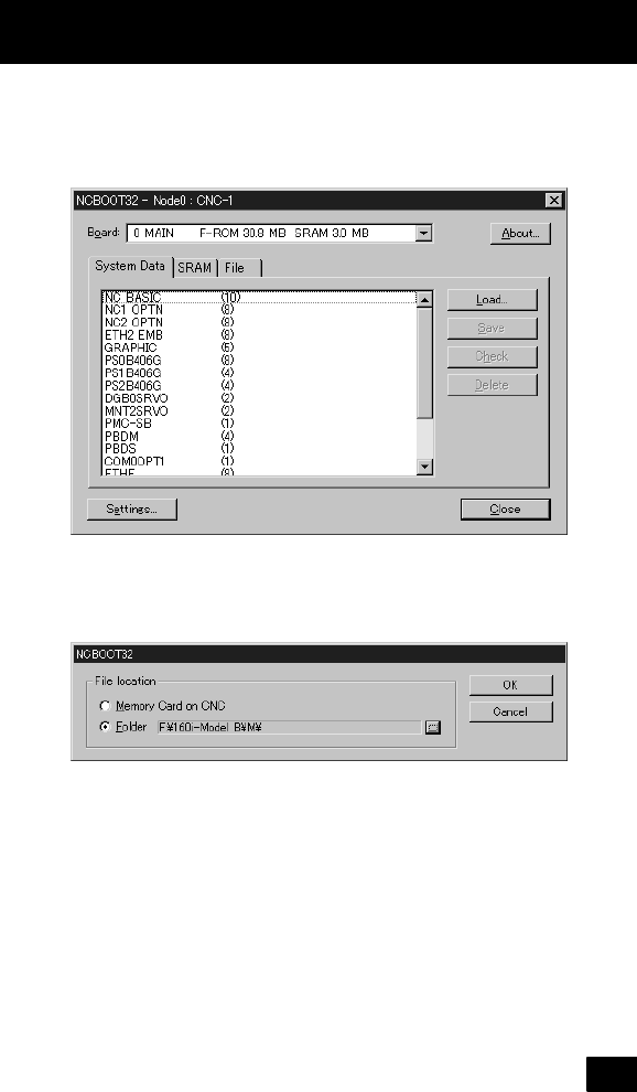 • Page 978n screen. Specify a file to be loaded. system data in a file. C system data. C system data. (SRAM tab) d restore NC SRAM data. and [Restore] restores SRAM data. In the ess status is displayed. As with the NC, the ed automatically from the SRAM size, and