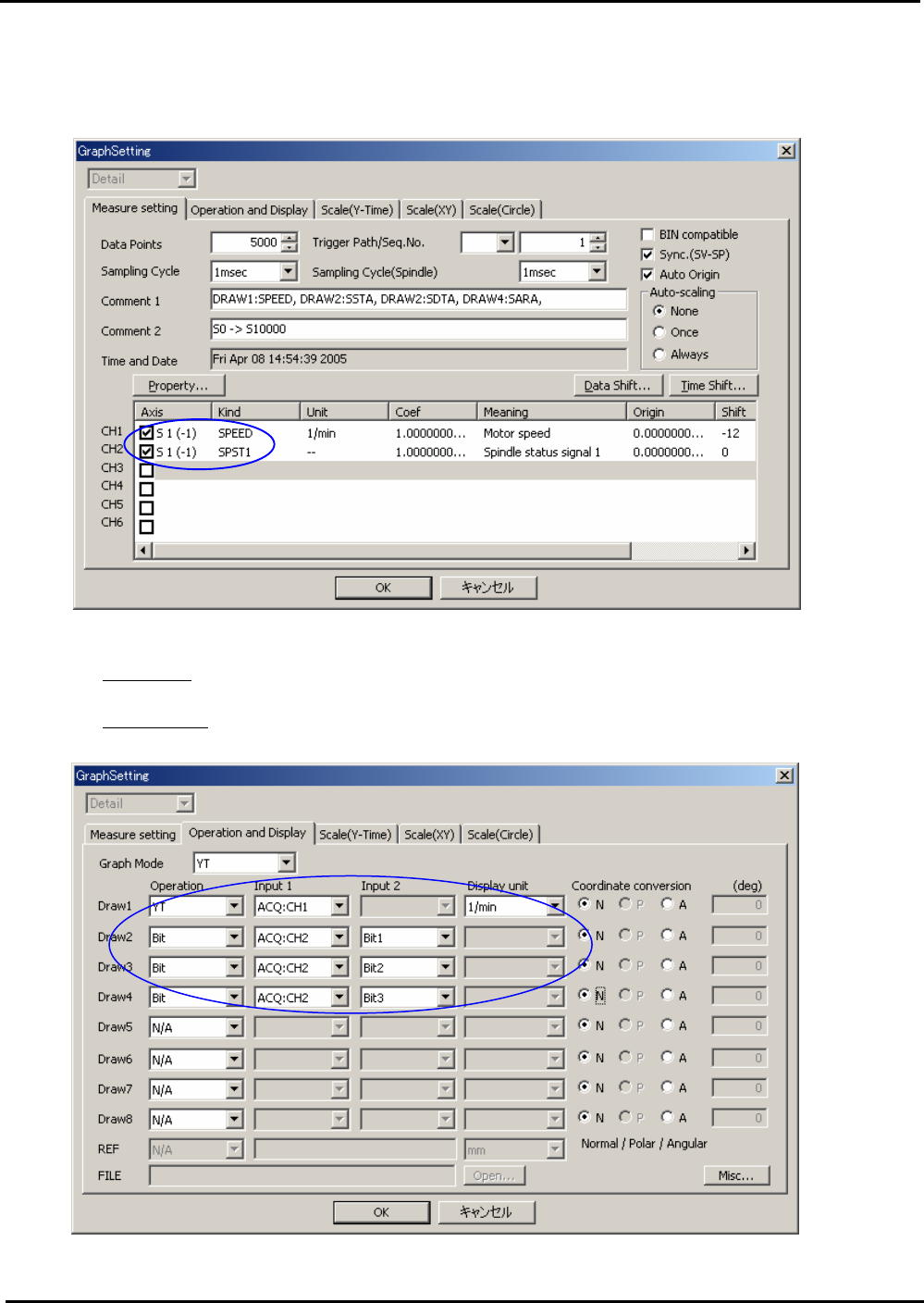 • Page 11Basic SPINDLE Tuning using SERVO GUIDE (4) Measuring SDTA, SSTA and SARA (PMC signals) with SPEED at acceleration. <1> Settings of measuring data CH1: SPEED (Motor Speed) CH2: SPST1 (Spindle status signal 1) <2> Settings of operation and display For Draw1 Operation : ”YT”, Input1 : CH1, Display unit