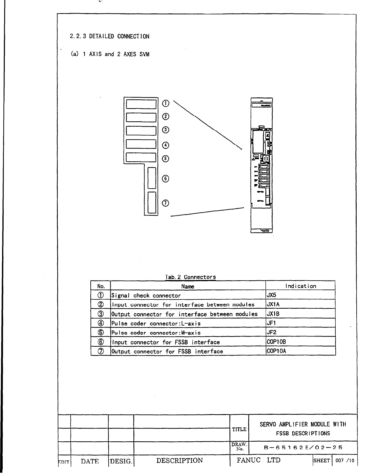 • Page 13(b) 3 AXES SVM Tab. 3 Connectors SERVO AMPLIFIER MODULE WITH - TITLE FSSB DESCRIPTIONS DRAW. No. B-651 62E/02-25 :DIT. DATE DESIG. DESCRIPTION FANUC LTD SHEET 008 110