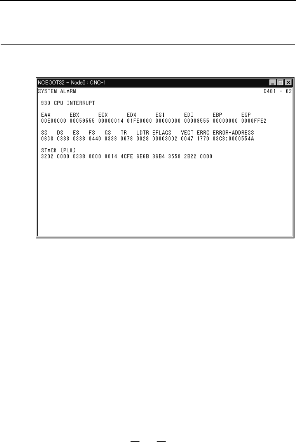 • Page 388E. MAINTENANCE OF OPEN CNC (BOOT–UP AND IPL) APPENDIX B–63505EN/02 E.4 OTHER SCREENS E.4.1 CNC System Alarm Screen This screen appears when a system alarm is issued in the CNC. (The above screen is an example. The displayed information varies depending on the system alarm issued in the CNC.) 370
