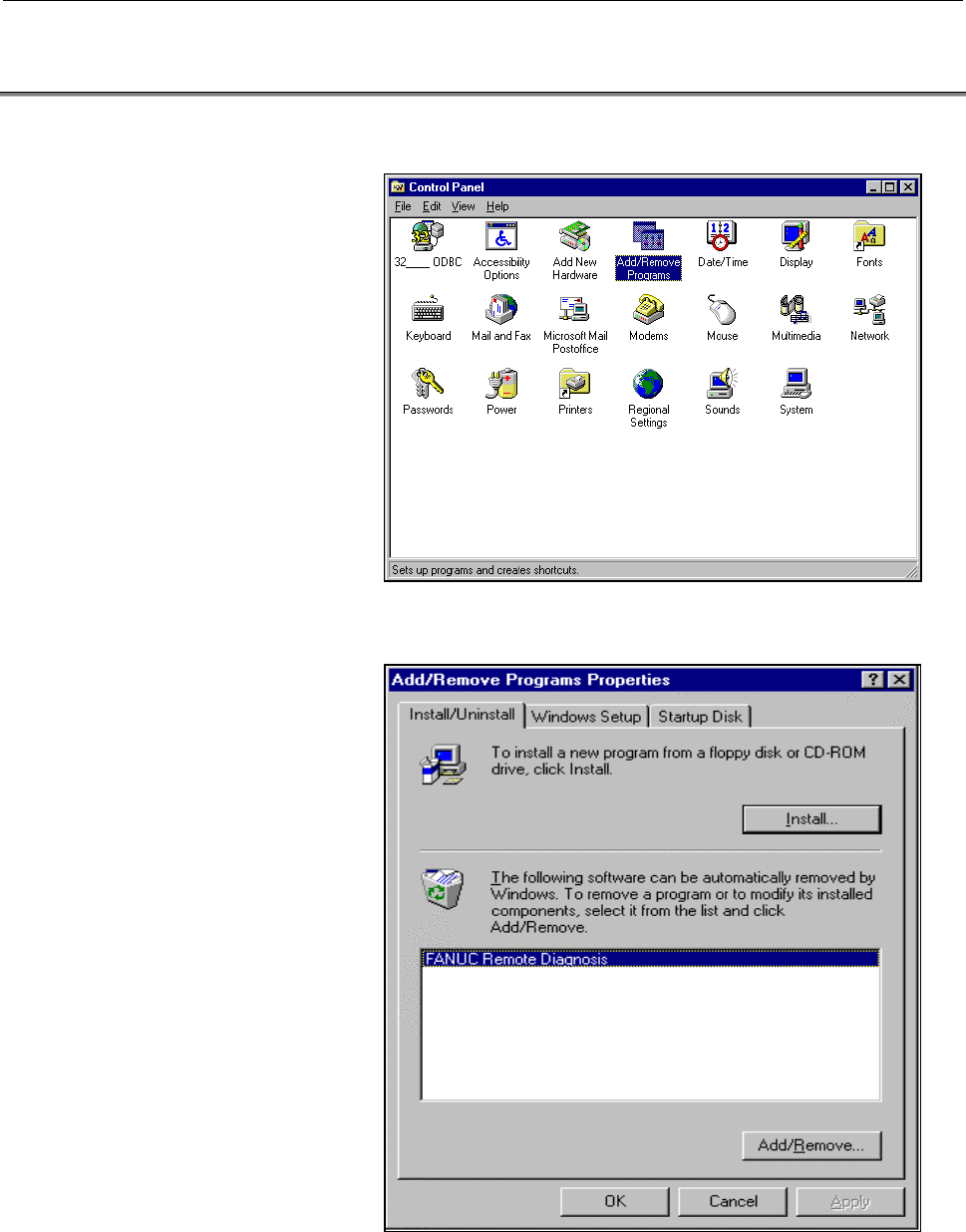 Page 232. INSTALLATION PROCEDURE B-63454EN/01 2.3 UNINSTALLATION (1) Start Add/Remote Programs in the Control Panel. (2) Specify deletion of the application "FANUC Remote Diagnosis." -14-