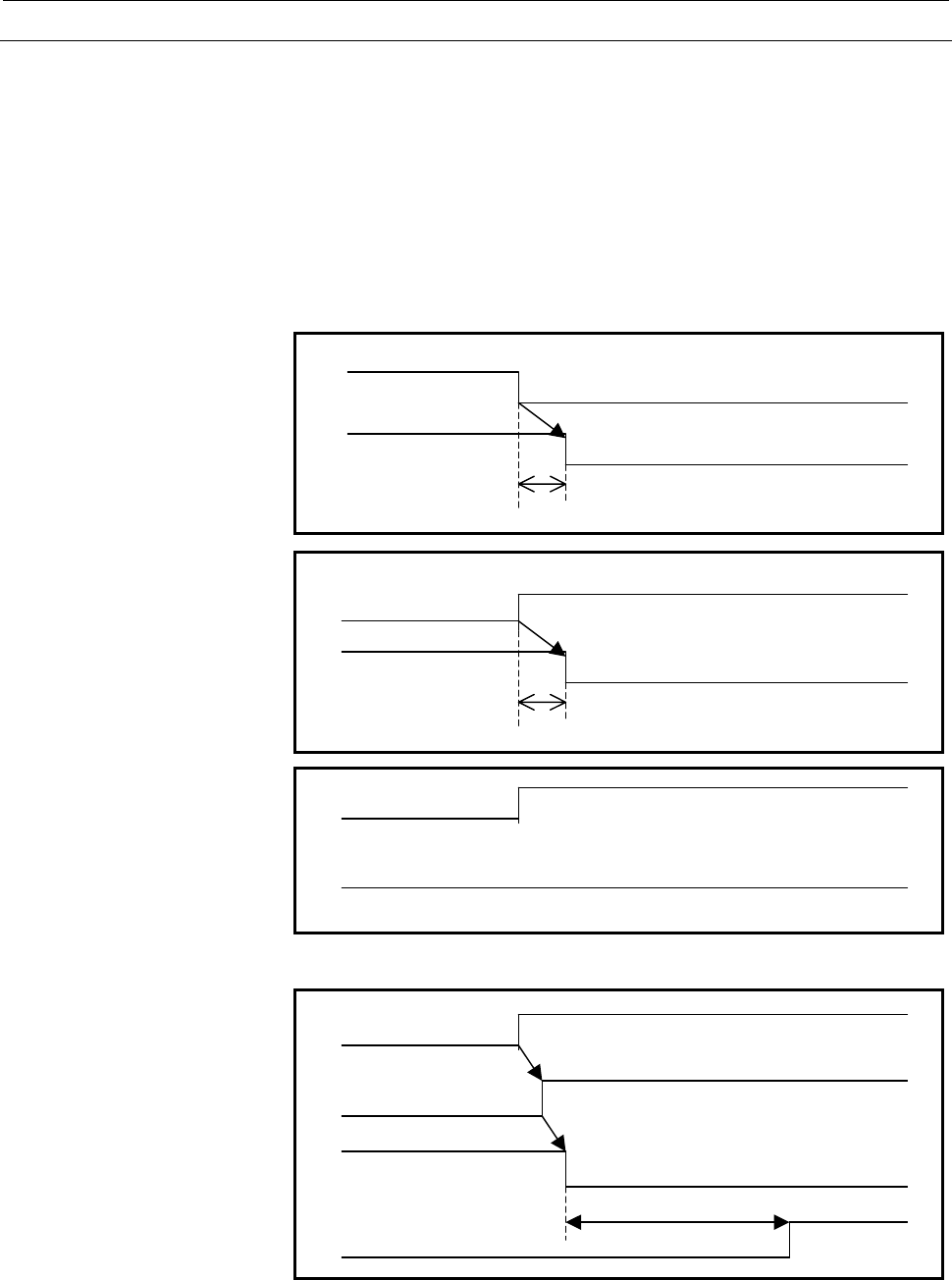 • Page 44GFKE-0218A-EN 3.SAFETY FUNCTIONS Timing chart of MCC off Test During test MCC test start (User signal) Brake on Vertical axis brake 500 ms or more Test mode signal OPT (QG1531 ) Servo-off signal SVF8-1(QG1016 -QG1009h) MCC off Test execution MCC off Test being request signal RQT executed (IF1531 ) P