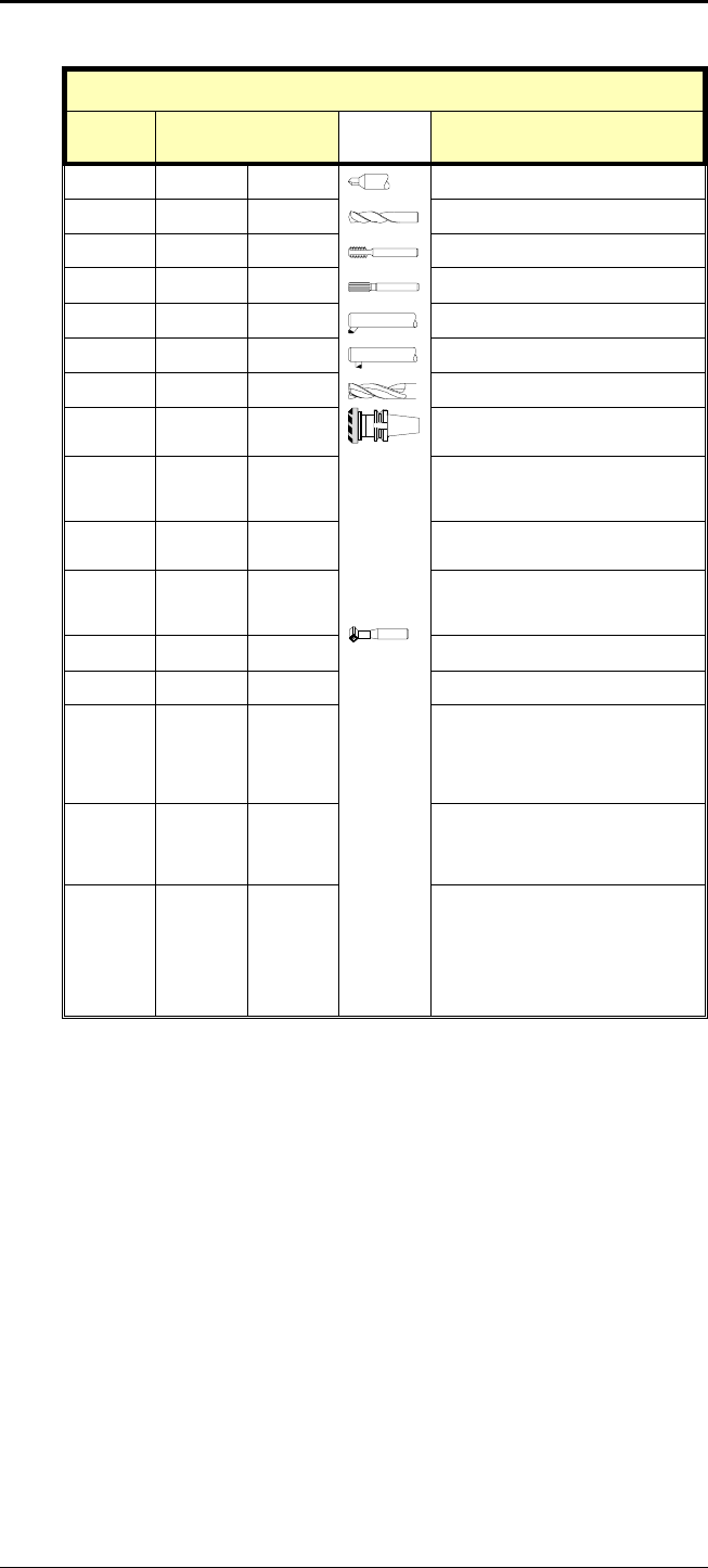 • Page 32Tool File GFKE-0041A-EN T O O L F I LE F O R ’S U P E R C A P M’ FILE ID - Tool Tool name C ode Offs.- L O ffs.-R N r. No. Ø T H D 115 7020 20 Endmill 116 7025 25 Endmill 117 7032 32 Endmill 118 7040 40 Endmill 119 7050 50 Endmill 120 121 7920 20 Carbide Endmill 122 7925 25 Carbide Endmill 123 7932