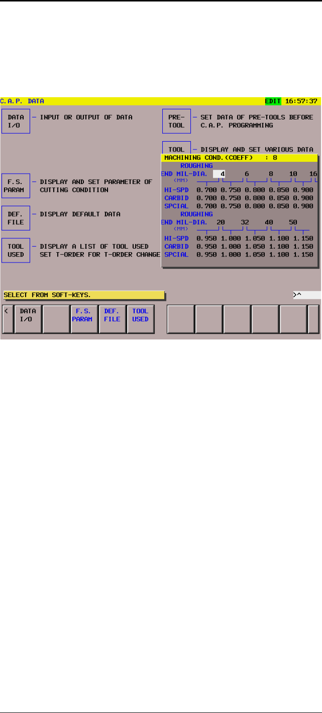 • Page 57GFKE-0041A-EN Cutting Conditions 8. 1 Machining Coefficient (4) 8. 1. 1 Machining Condition (COEFFICIENT) : 1 This screen should be selected first. All types of tools can be set to a diameter range. This is, to calculate automatically different feed for different diameter with the same basic feedrat