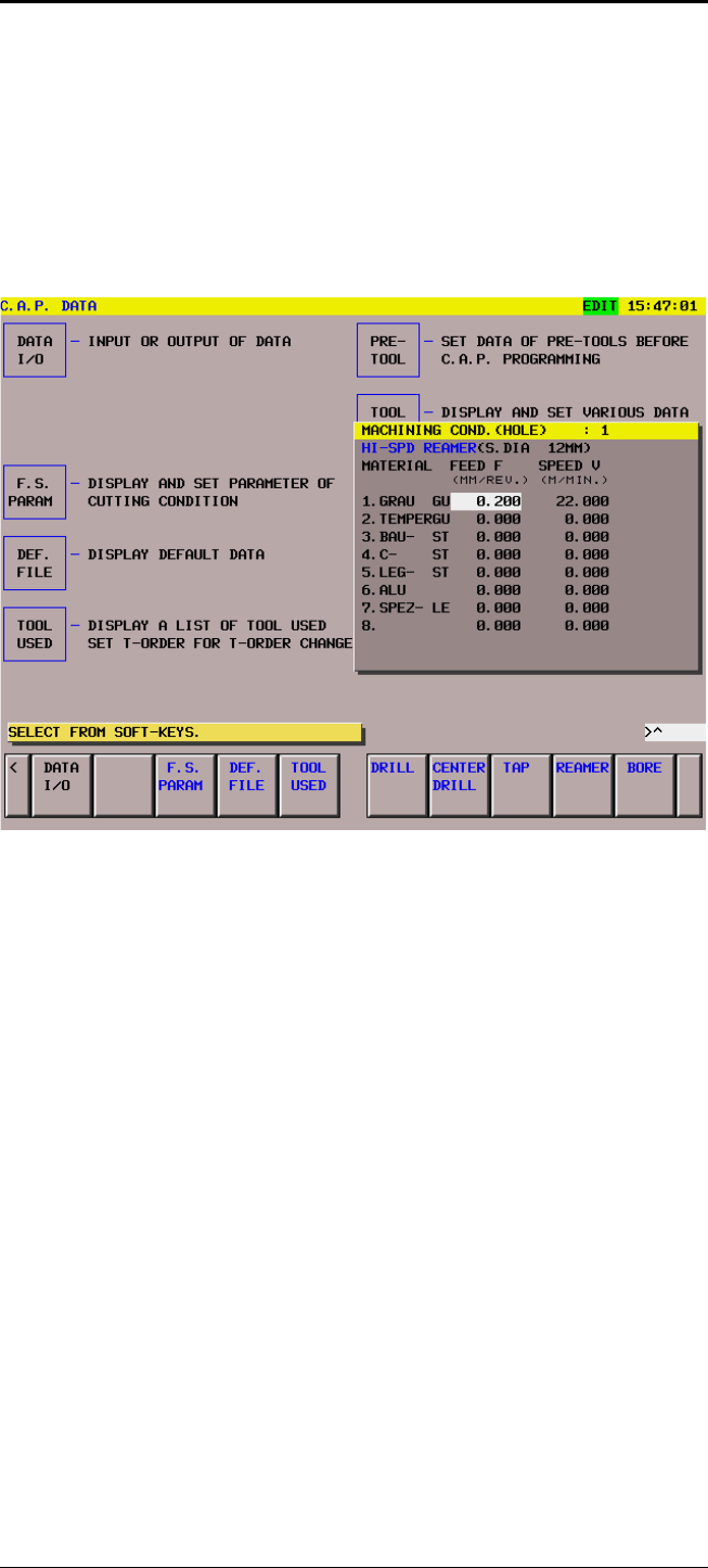 MER) is selected. Pushing the softkey (REAMER), cutting speed and