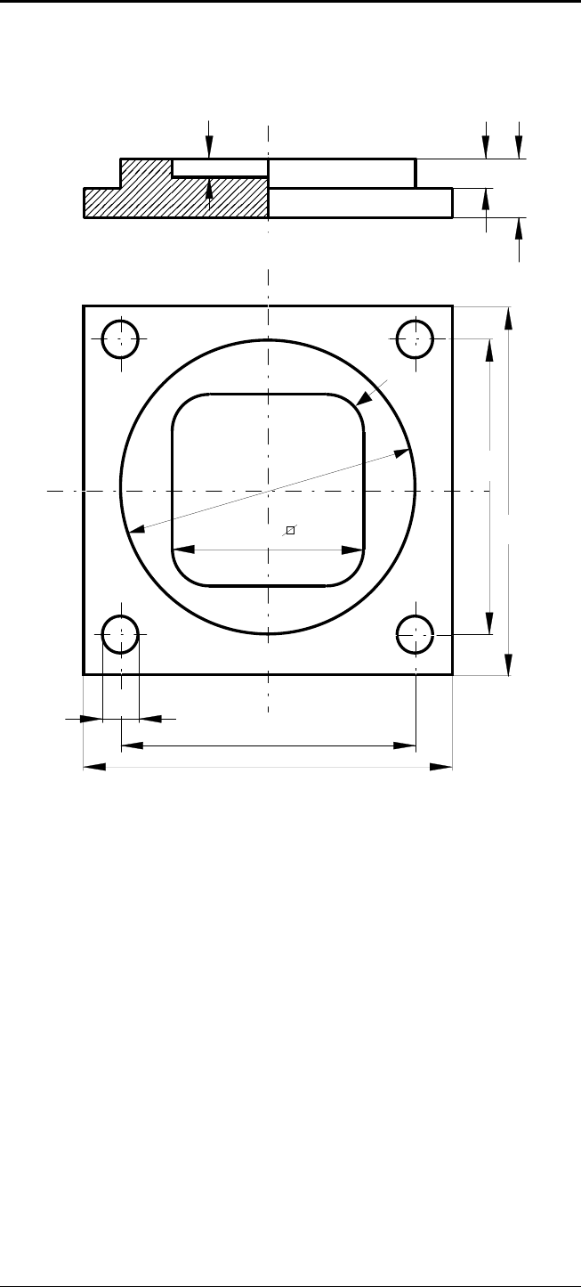 • Page 108GFKE-0041A-EN Detailed Programming Examples 10 B. 2. 3 Example POCKET/GROOV :SQUARE POCKET 15 30 COORDINATES: W= * U LENGTH : U= 100. START POINT : B= (1) WAY OF CUTN:YA= DOWN CUT V LENGTH : V= 100. X CO-ORD : X= 0. CORNER-RAD. : R= 12. Y CO-ORD : Y= 0. ANGLE : A= 0. PROCESS END HOLE : REAMING GROUP