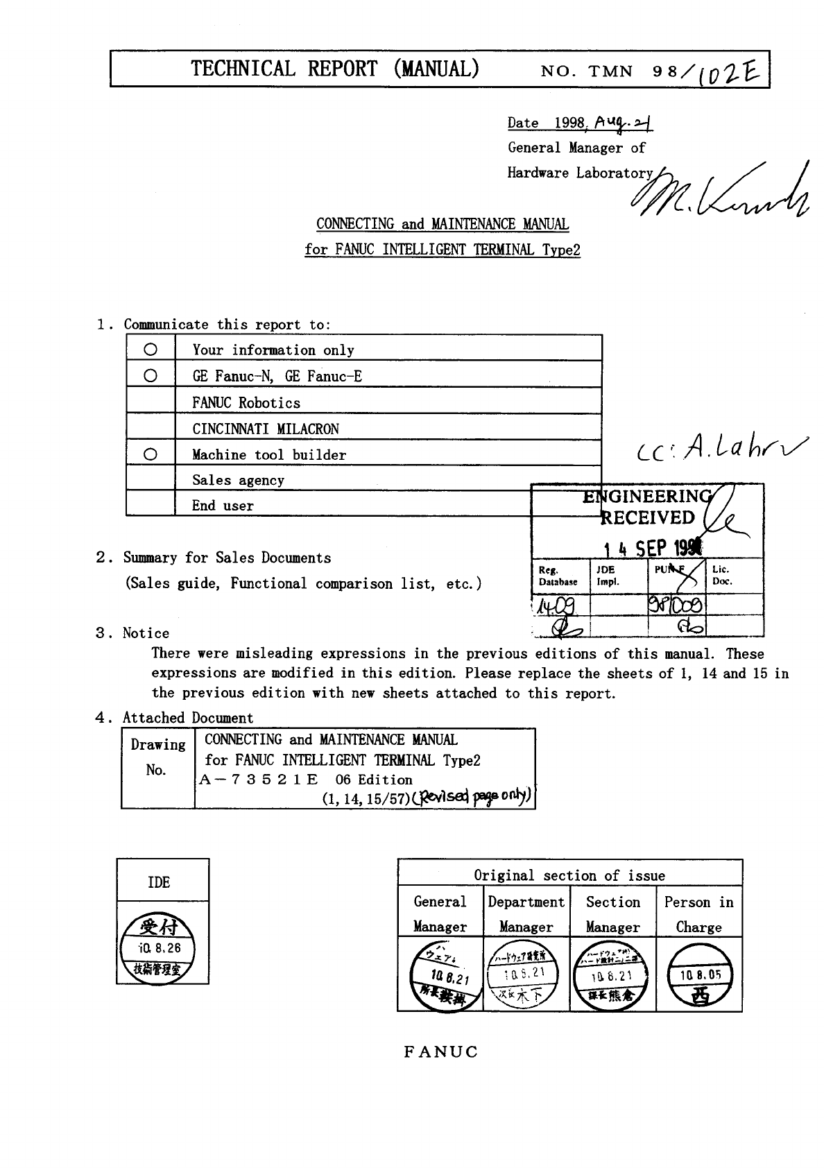 Connecting and Maintenance Manual for Fanuc Intelligent Terminal Type 2 (A-73521E/06) Additional Manual Page 1