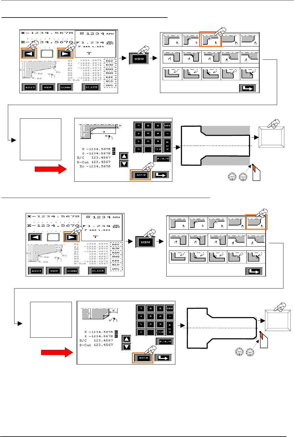 • Page 36QuickTurn™ Step 4 Select Memory Position 1 Æ Edit and Save Stop Cycle 1 00 X= 30 Cutting as automatic cycle (D-cut≠0) Z= -70 R/C= 7 Cycle D-Cut=1 Start X0= 60 Input Data X Z Step 5 Select Memory Position 2 Æ Edit and Save Stop Cycle for Chamfer Cutting 2 00 X= 30 Cut in 1 time (D-Cut=0) Z= 0 R/C= 2