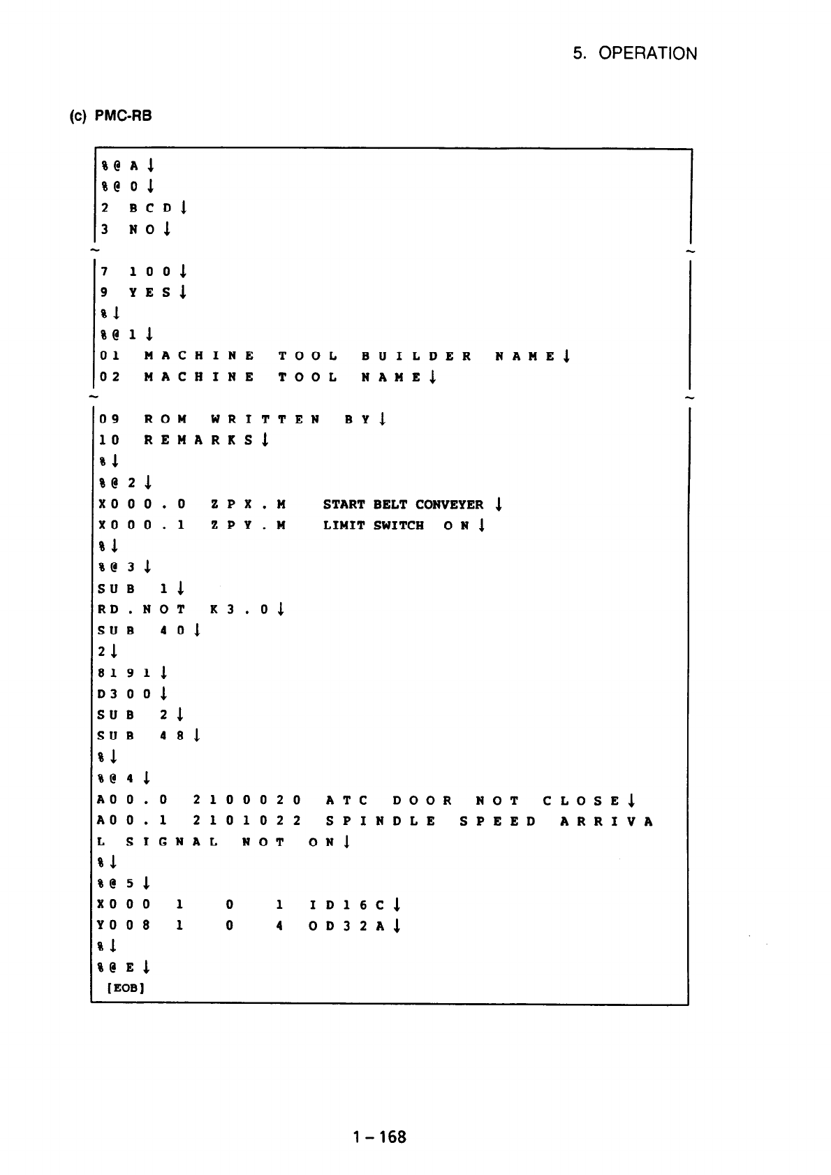 • Page 1735. OPERATION 5.7.5 Sample mnemonic files (all-format) (a) PMC-M %@ A 1 %@0 1 1 3901 2 11 8 11 9 11 el ee 11 01 MACH INE TOOL BUILDER NAMES 02 MACH INE TOOL NAME1 09 ROM WRITTEN BYA 10 REMA RKSl sl %@ 2 1 x000.0 2PX.M START BELT CONVEYER 1 x000.1 2PY.M LIMIT SWITCH ONS. %l %@ 3 1 SUB 11 RD. NOT x3.01