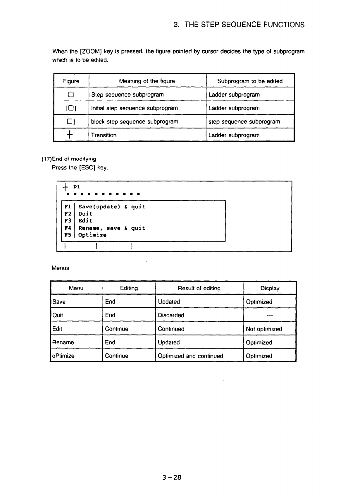 • Page 2333. THE STEP SEQUENCE FUNCTIONS When the [ZOOM] key is pressed, the figure pointed by cursor decides the type of subprogram which is to be edited. L Figure Meaning of the figure Subprogram to be edited 0 Step sequence subprogram Ladder subprogram 101 Initial step sequence subprogram Ladder subprogram